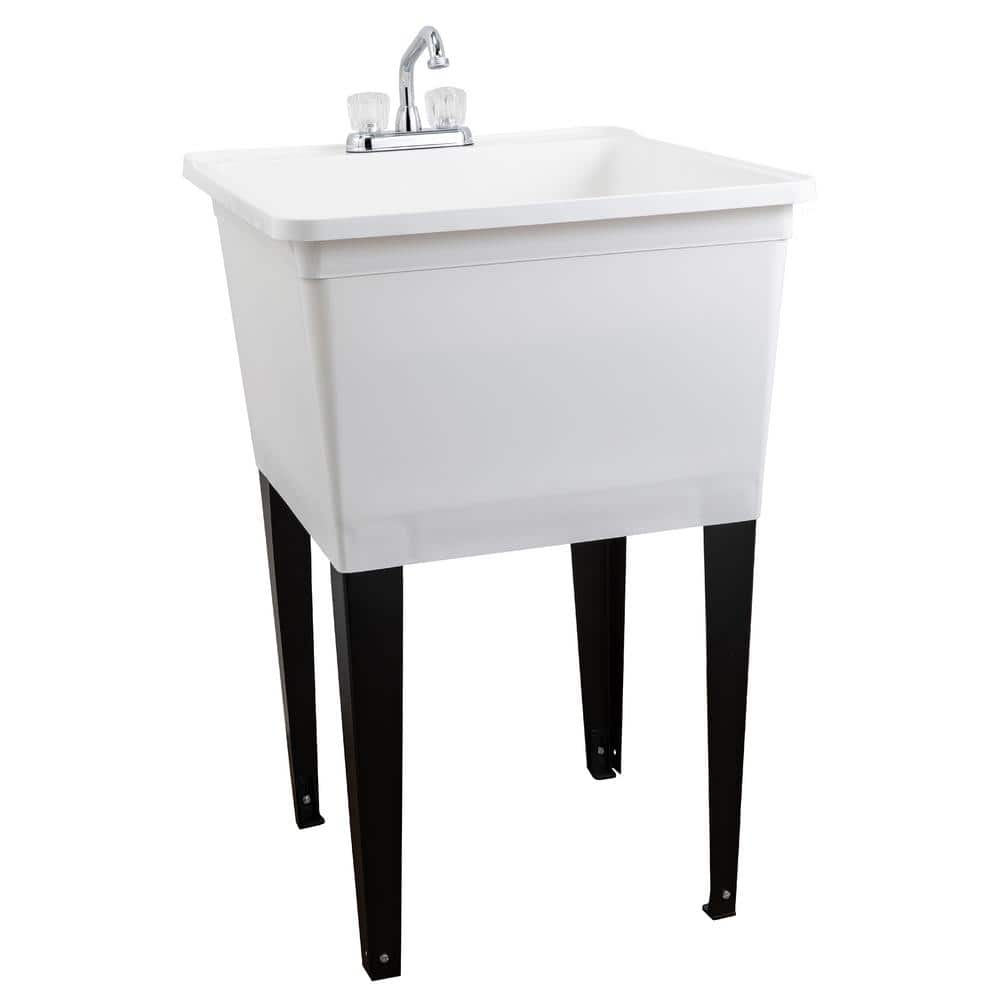 The TEHILA Freestanding Utility Sink offers an impressive 21-gallon capacity with a sturdy thermoplastic construction that resists stains and cracking. Complete with a chrome finish faucet and adjustable rust-proof steel legs, it's perfect for any laundry room or workshop space. This comprehensive sink kit includes everything needed for easy installation, turning any home or work area into a functional cleaning hub.