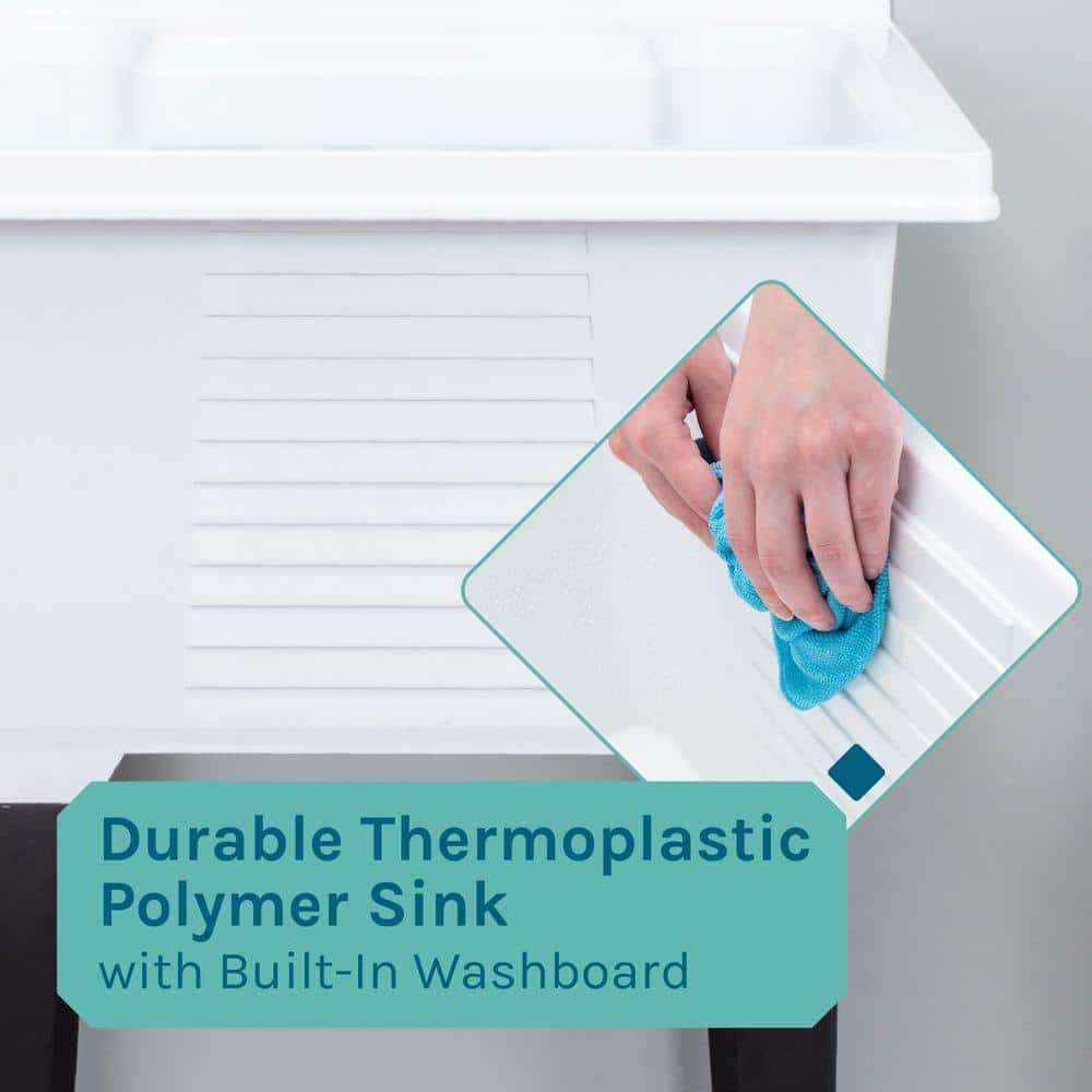 Upgrade your laundry or utility space with the elegant TEHILA Freestanding Utility Sink, featuring a durable ABS plastic basin and a chic black hi-arc pull-down faucet. This versatile sink offers both style and functionality with its integrated washboard and matching accessories. Perfect for handling tough stains and everyday cleaning tasks.