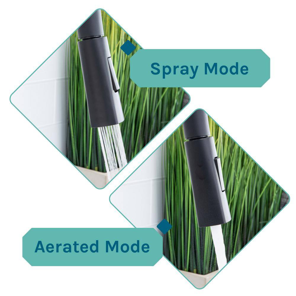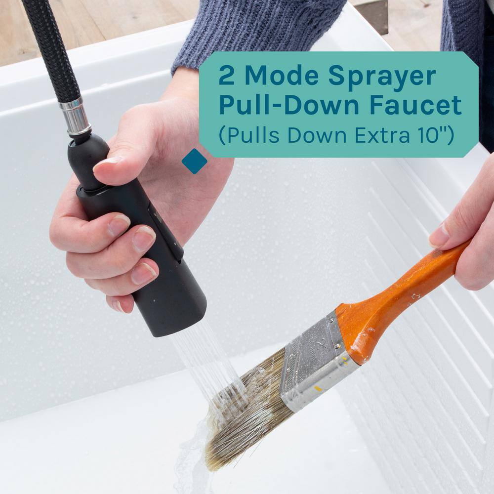 A: Yes, the sprayer head pulls down an extra 10 inches and can easily toggle between spray and aerated water settings.