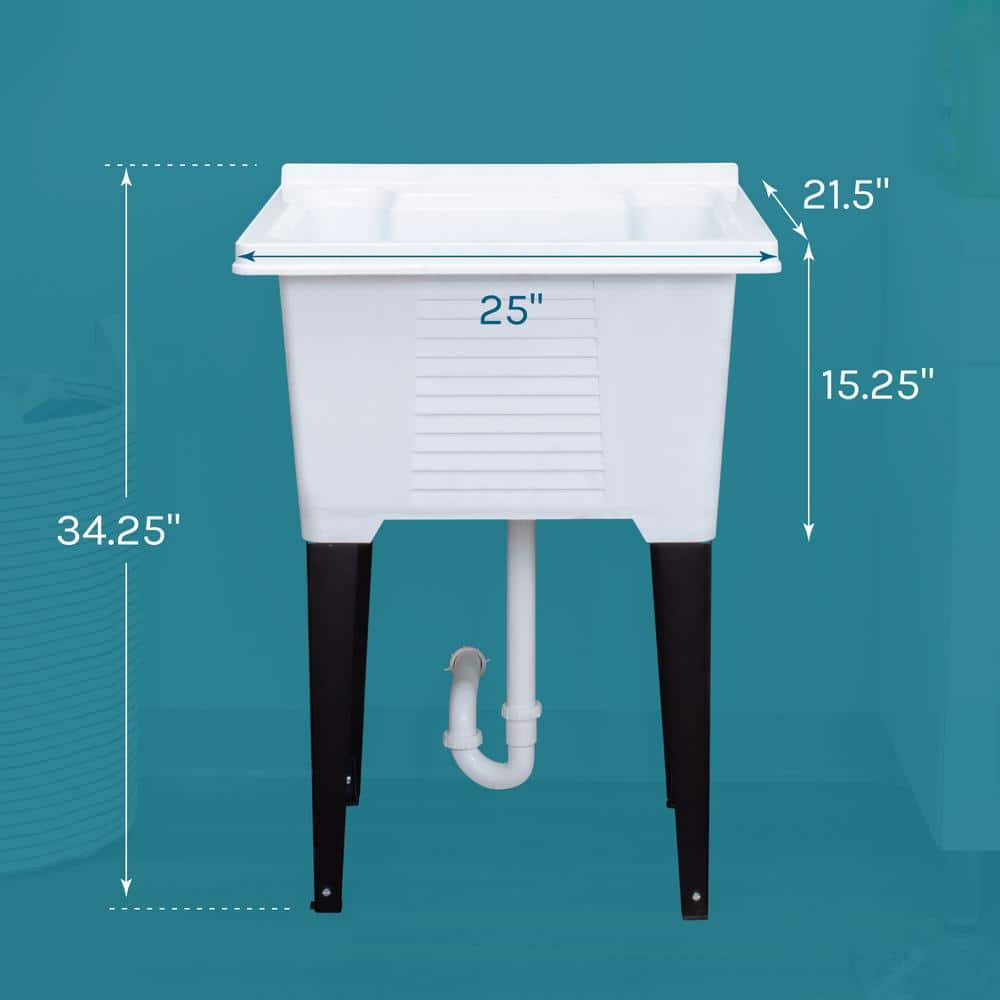 Elevate your laundry area with the TEHILA Freestanding Utility Sink, designed for modern functionality and style. Featuring a robust ABS plastic construction with a glossy white finish and sturdy black metal legs, this sink can hold up to 18 gallons and includes a built-in washboard for tackling tough stains.