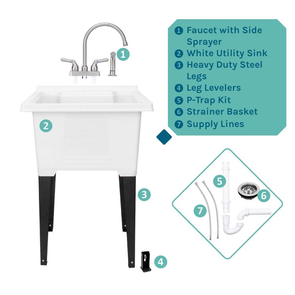 Elevate your utility room with TEHILA's freestanding ABS plastic sink, complete with a sleek stainless gooseneck faucet and side sprayer. The 18-gallon capacity and built-in washboard make it a practical choice for any laundry or basement area, while its sturdy design ensures long-lasting use.