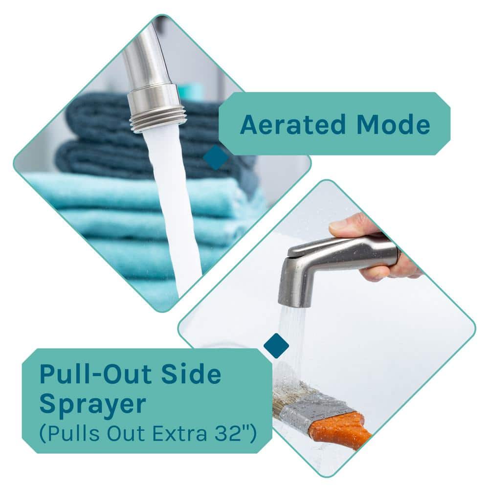 A: The gooseneck faucet offers excellent reach, and the side sprayer extends 32 inches for added flexibility and cleaning power.