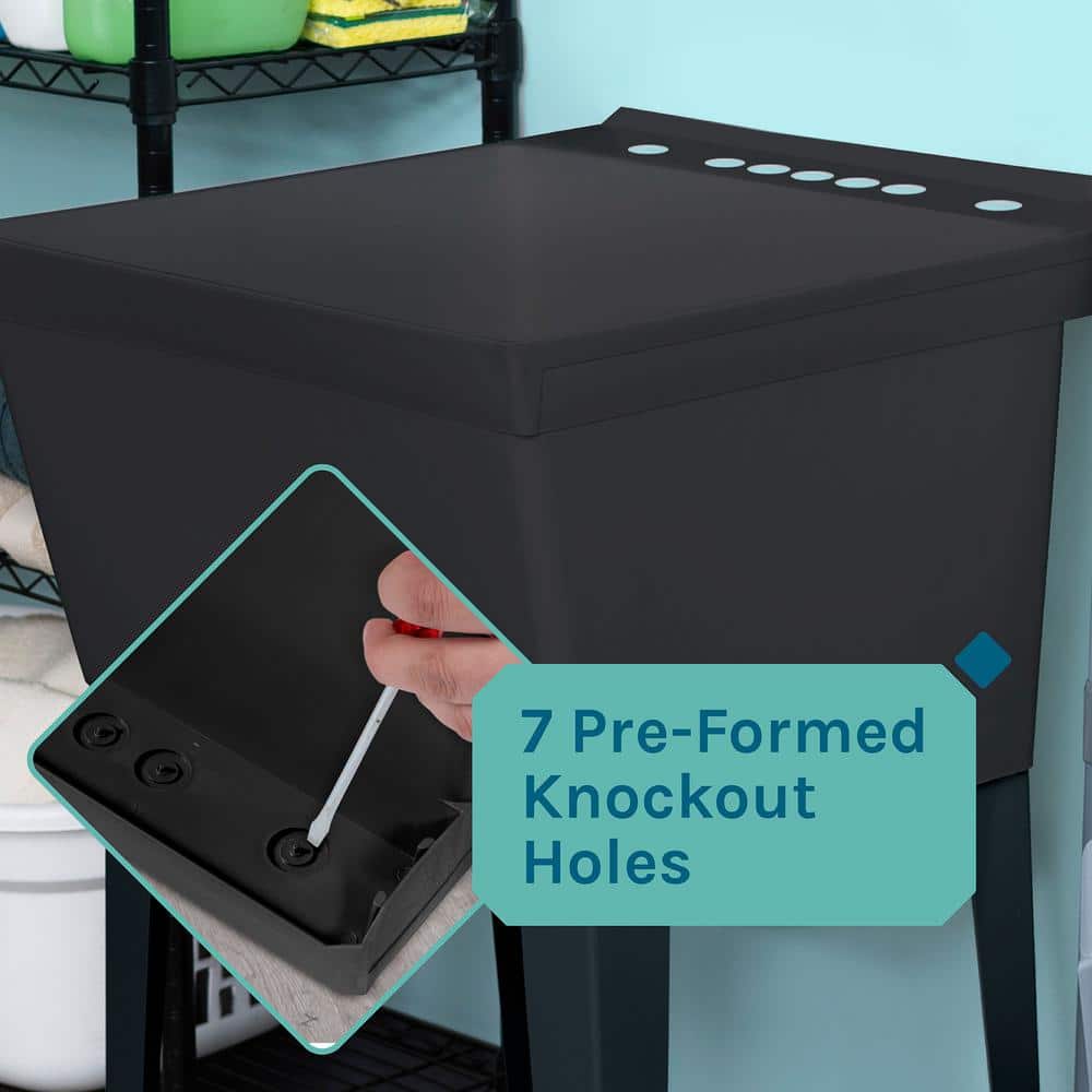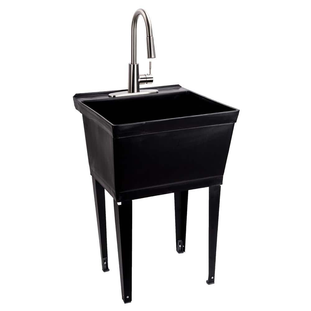 Enhance your workspace with the TEHILA Complete 19 Gal. Black Utility Sink, designed for efficiency and style. Featuring a deep basin and a brushed stainless-steel high-arc pull-down faucet, it offers robust functionality for any cleaning task. Constructed from high-quality thermoplastic with adjustable steel legs, this sink guarantees long-lasting use.