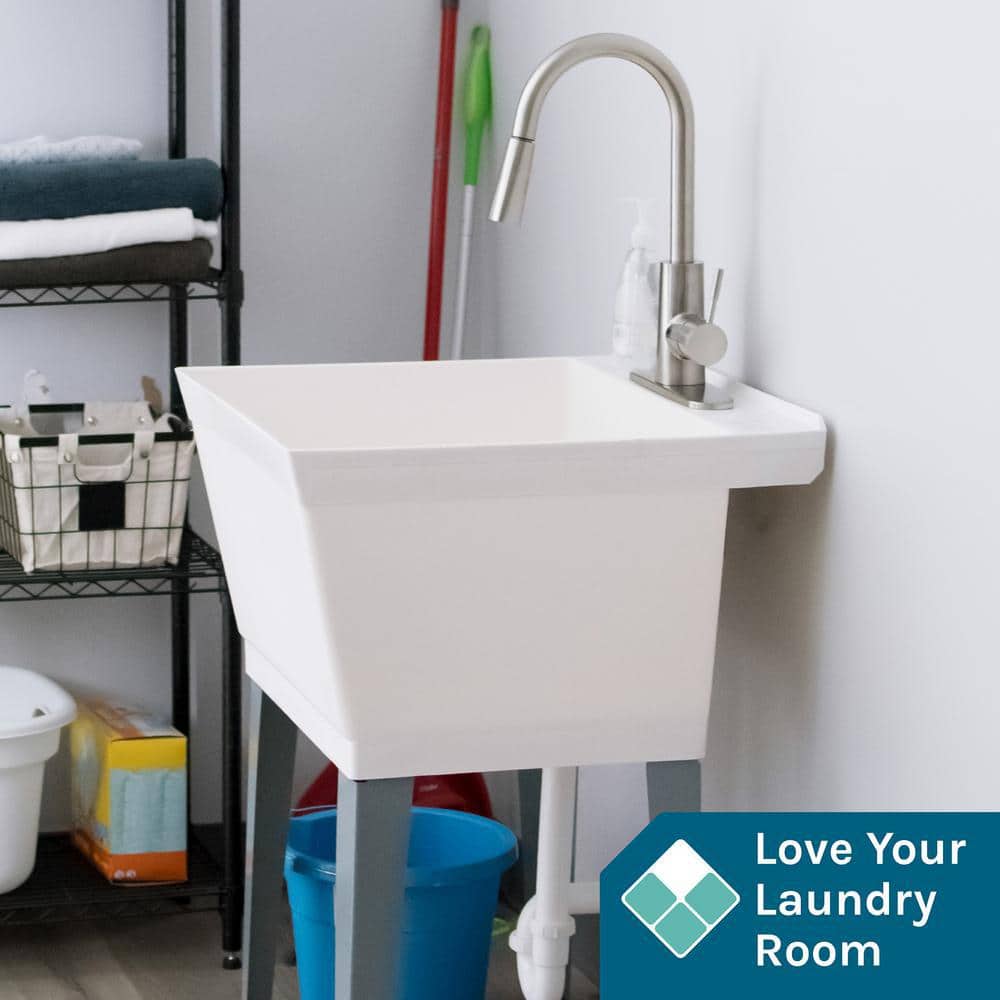 The TEHILA Complete Utility Sink Set is the perfect blend of elegance and function with a 19-gallon capacity. Constructed from durable thermoplastic, it resists rust and stains, while the stainless steel pull-down faucet adds versatility and convenient operation. Ideal for handling messy tasks, this setup includes everything needed for installation, making it an excellent choice for any laundry room or workspace.