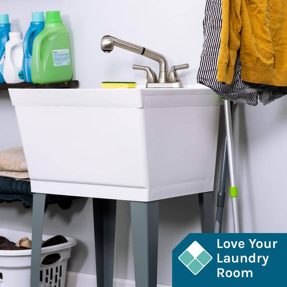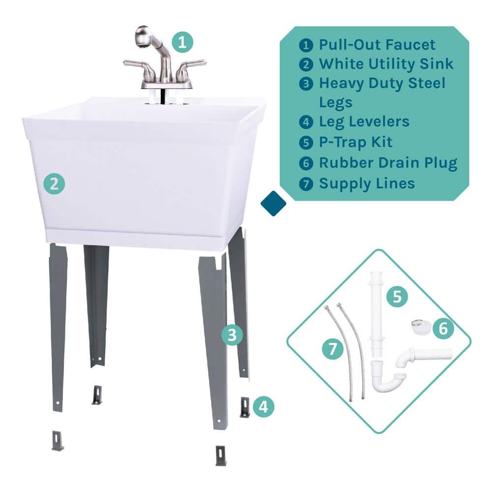 Upgrade your laundry or utility space with the TEHILA 19 Gallon Utility Sink Set, complete with a pull-out stainless steel finish faucet. This set includes a deep, stain-resistant thermoplastic basin with sturdy adjustable legs, offering high durability and stability. Perfect for handling bulky tasks with ease, it redefines efficiency and style in utility sinks.