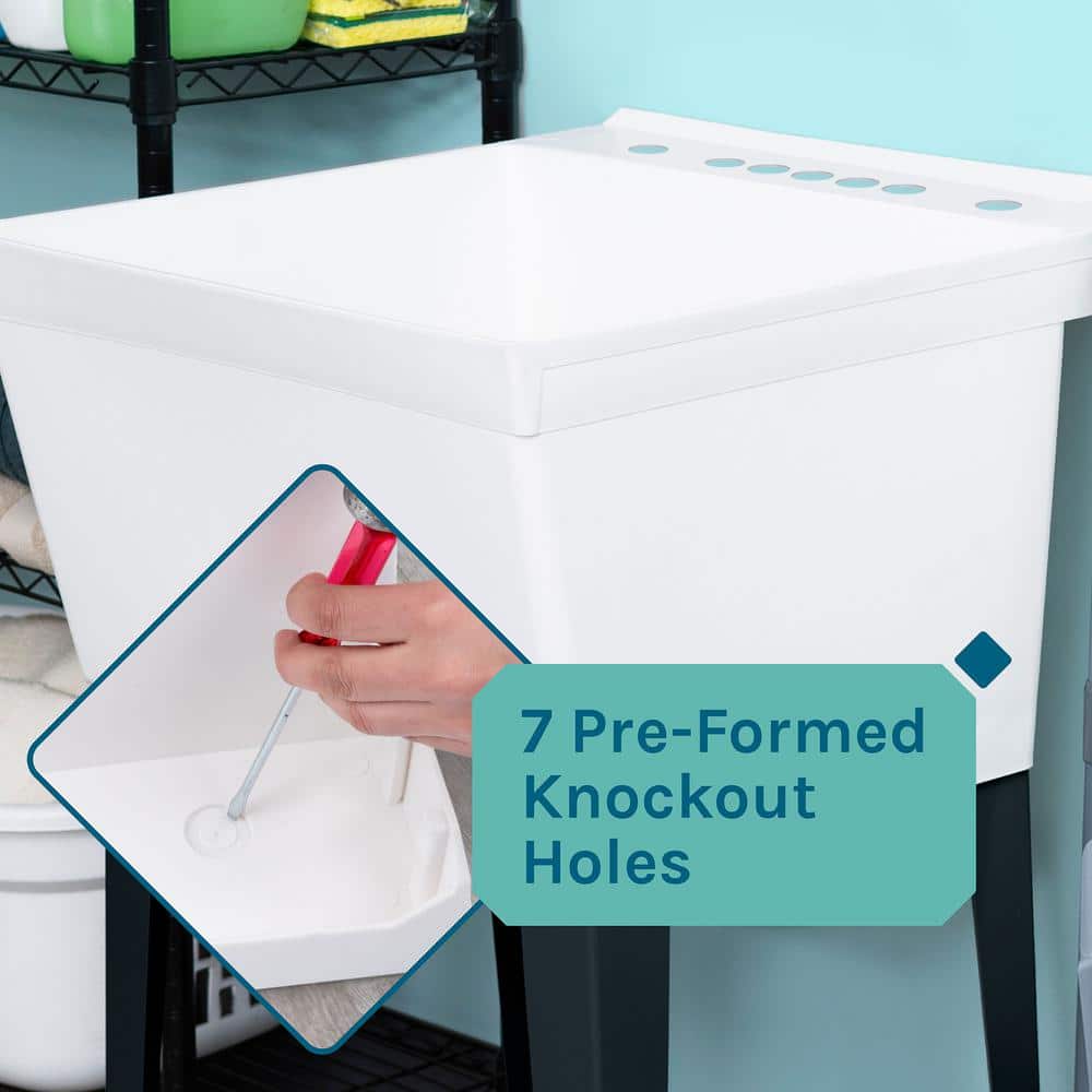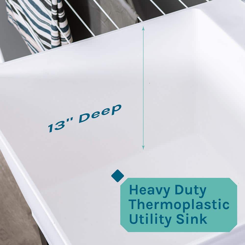 The TEHILA Complete White Utility Sink is designed to meet all your cleaning needs with its durable thermoplastic construction and 19-gallon capacity. Featuring a high-arc stainless steel faucet and side sprayer, this sink caters to professional and DIY tasks alike, offering both functionality and style. Included metal legs with adjustable levelers ensure stability, making it an ideal choice for garages, basements, and laundry rooms.