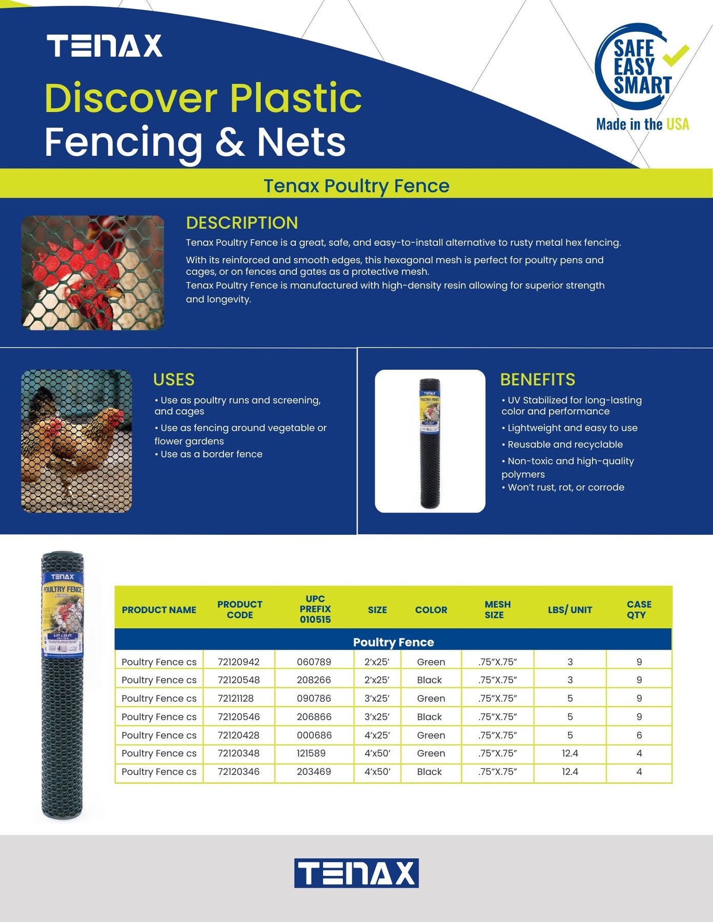 Transform your poultry area or garden with Tenax's eco-friendly alternative to traditional metal fencing. This green, HDPE chicken wire provides superior durability without rusting or corroding, offering seamless protection against predators. Easy to install and unobtrusive in your landscape, it's the perfect choice for a secure and visually appealing fencing solution.