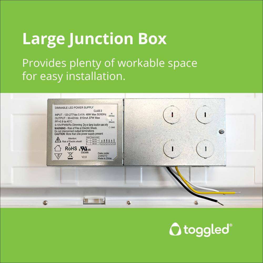 - Installation: Fits standard T-bar grid ceilings, with a large junction box for hassle-free mounting