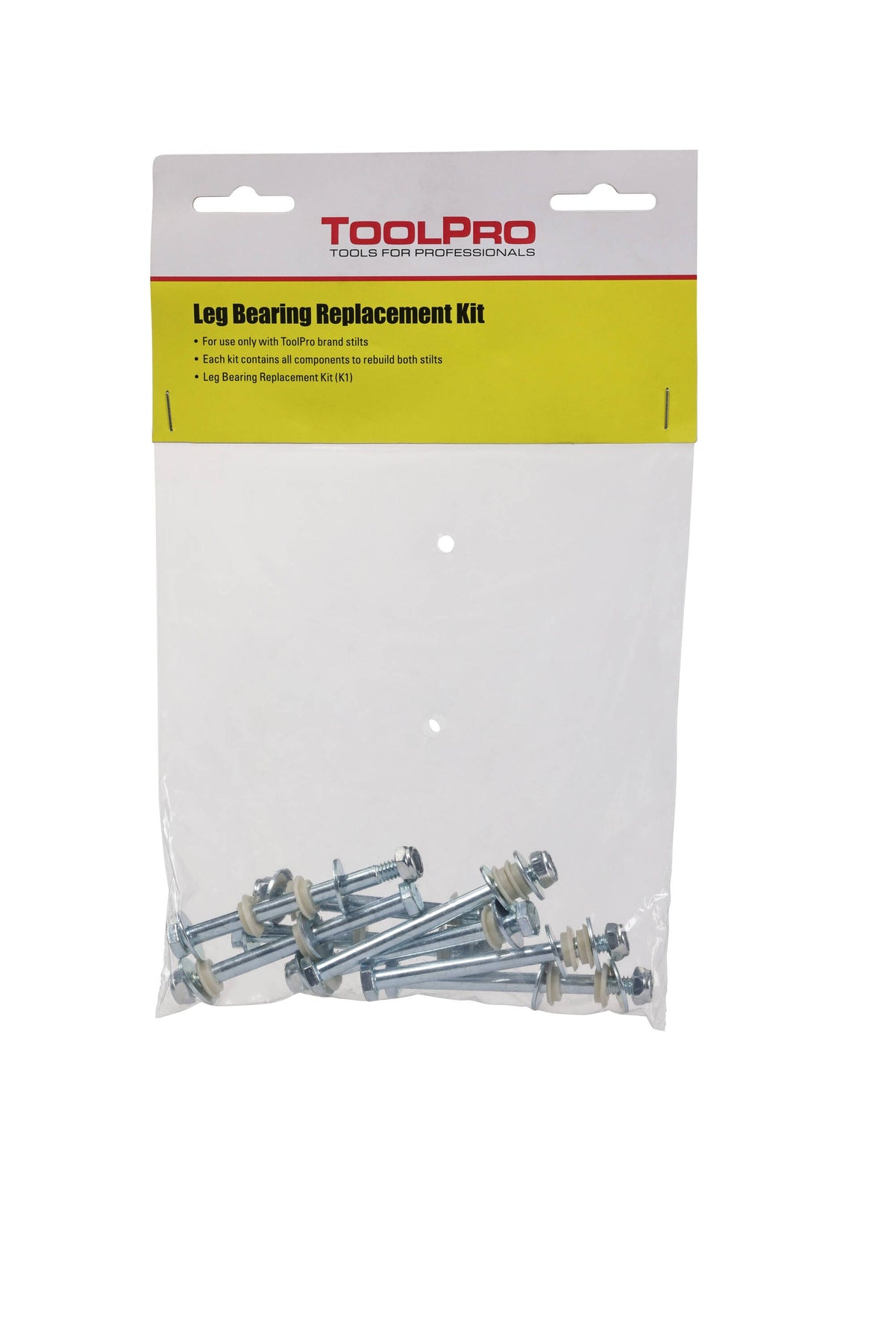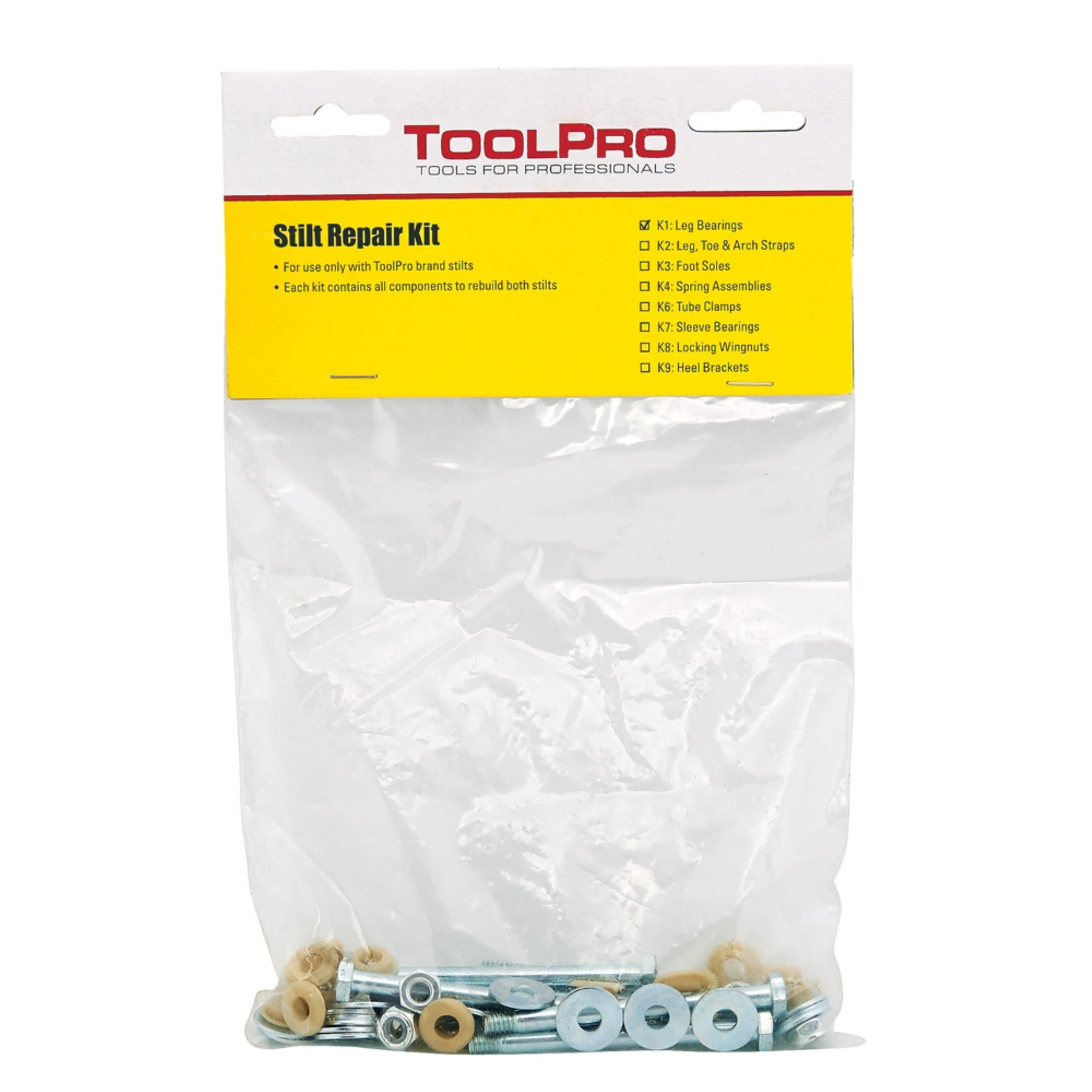 A: The kit includes leg bearings, flat washers, locknuts, and cap screws, sufficient for both sides of the stilt.