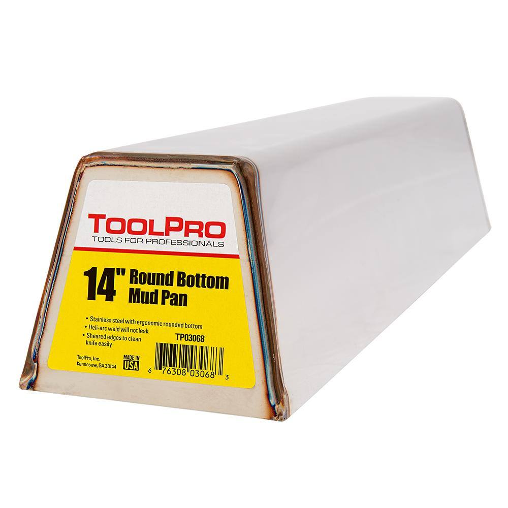 The ToolPro 14 in. Stainless Steel Mud Pan is designed for comfort and ease during drywall finishing tasks. Featuring a rounded bottom, it fits securely in your hand, allowing for effortless scooping and cleaning, even after hours of use. Crafted from durable stainless steel, this mud pan is built to withstand the rigors of professional use.