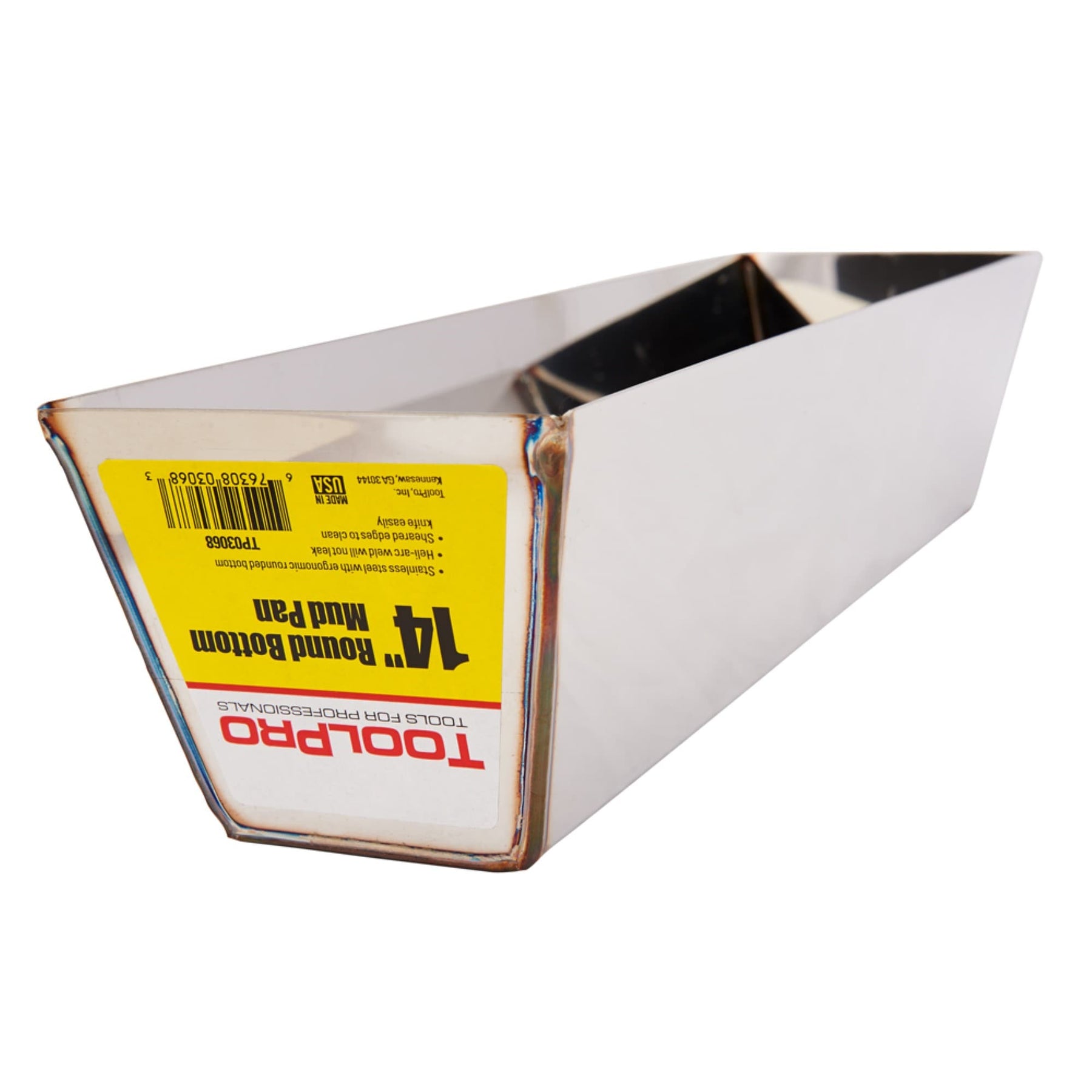 The ToolPro 14" Stainless Steel Round Bottom Mud Pan is specifically designed for professional drywall work, offering durability and ease of use. Its contoured design is not only comfortable during extended use but also allows for efficient scooping of materials, making it a staple in any contractor's toolkit.
