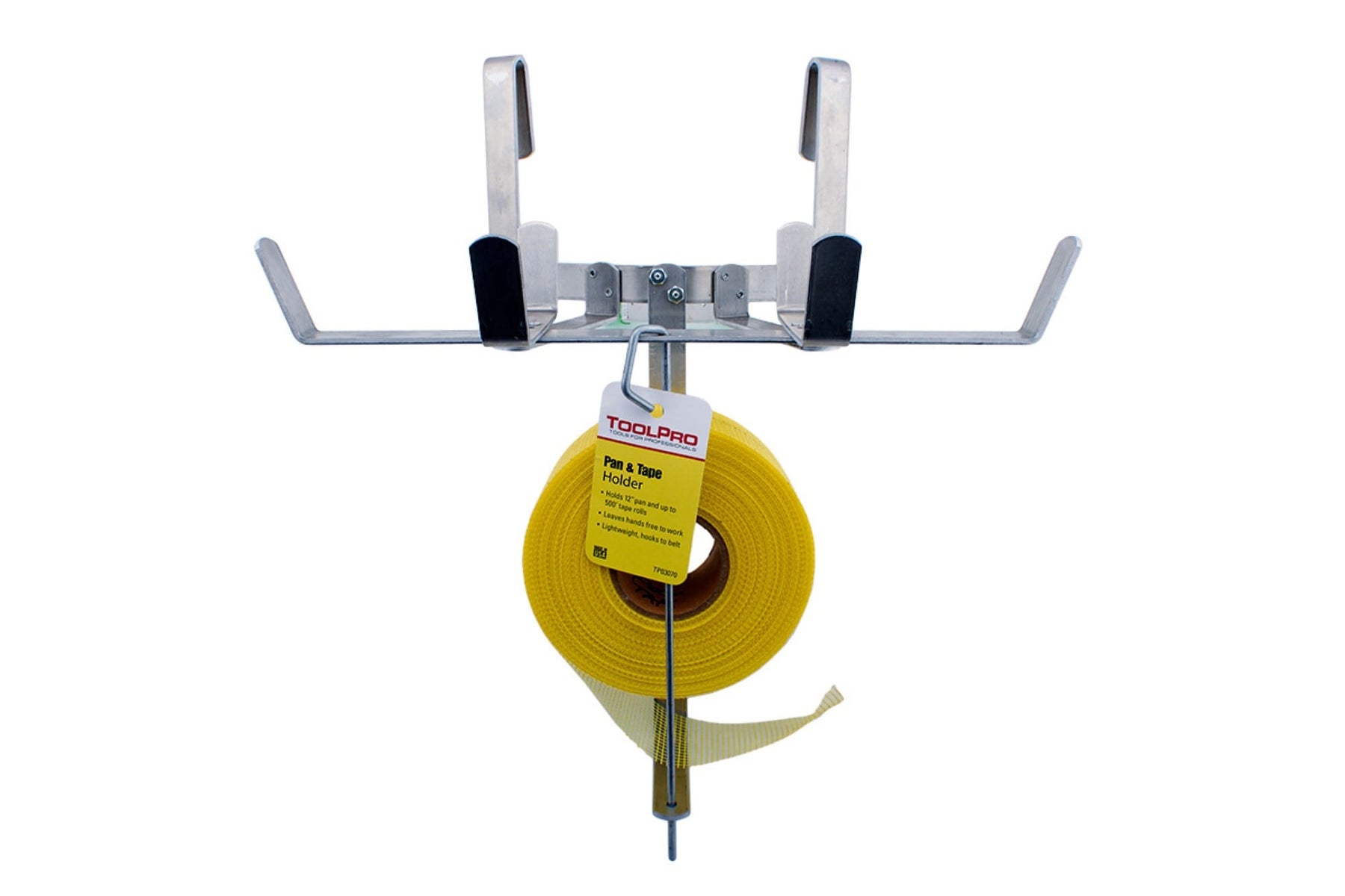 A: The ToolPro Holder can carry a standard 12-inch mud pan and a 500-foot roll of joint tape, suitable for most drywall projects.