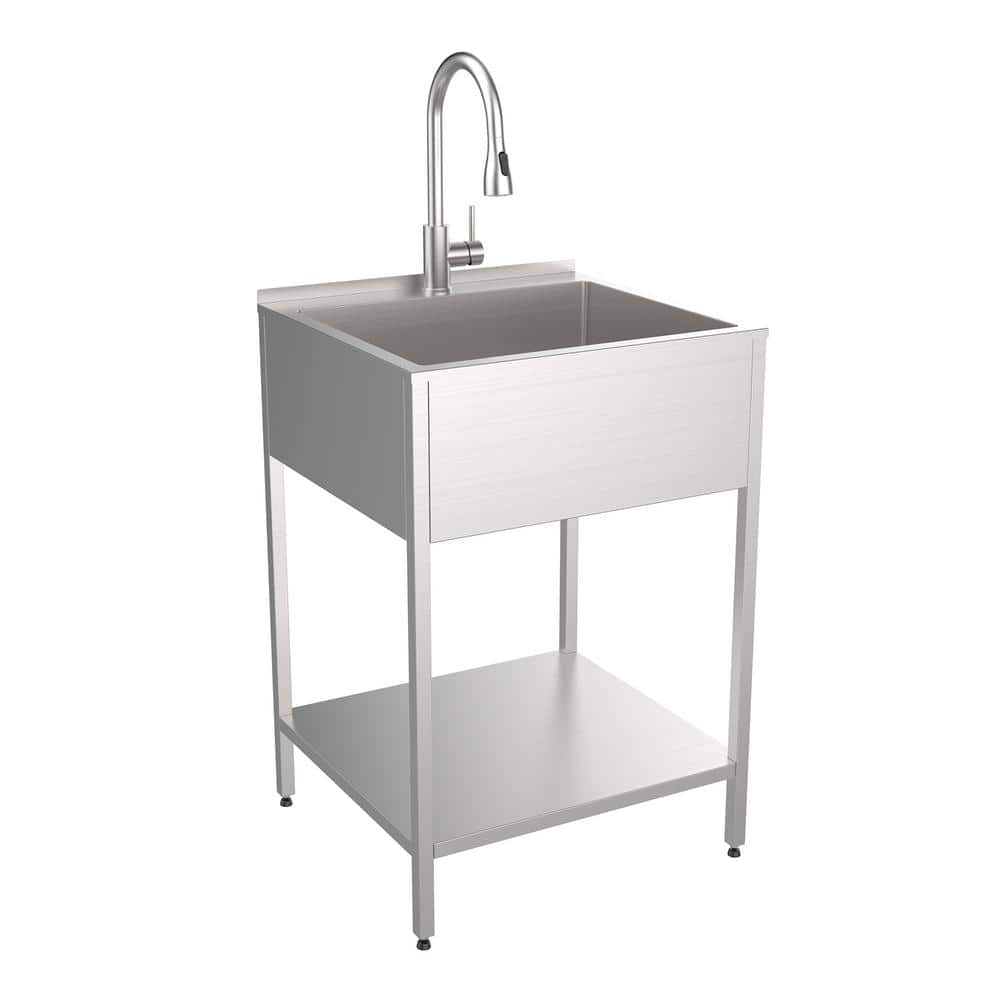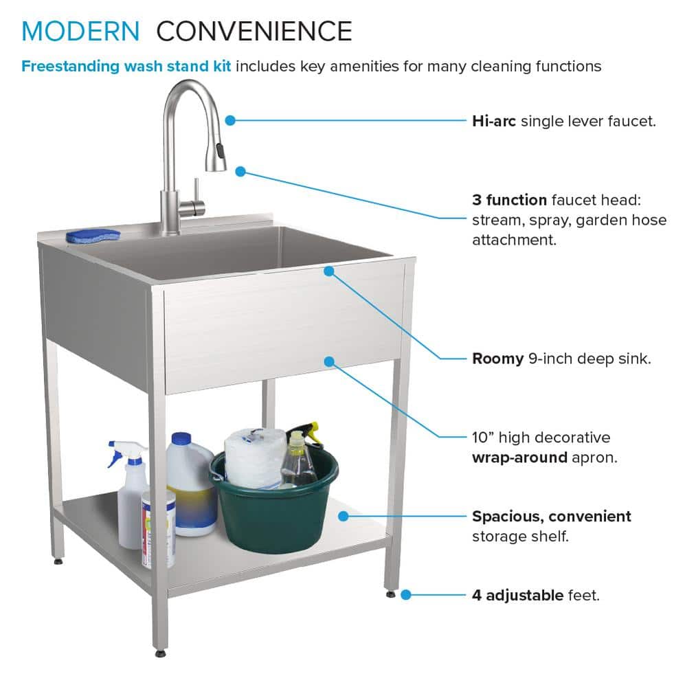 The Transolid 15 Gallon Freestanding Laundry Sink with Cabinet is a compact and stylish solution for all your indoor and outdoor cleaning needs. Featuring durable 18-gauge stainless steel construction, it’s designed for both functionality and modern aesthetics. Perfect for tight spaces, this sink comes with a pull-down dual-spray faucet and a washstand for convenient storage.
