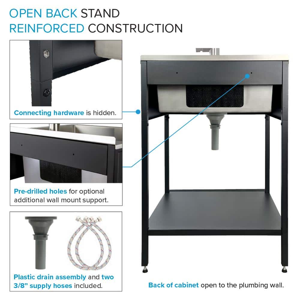 Experience the modern utility of the Transolid 15-Gallon Freestanding Laundry Sink. This all-in-one unit boasts a durable 18-gauge stainless steel basin paired with a sleek matte black cabinet. Its versatile design makes it ideal for compact spaces and both indoor and outdoor applications, transforming any laundry or utility area with style.