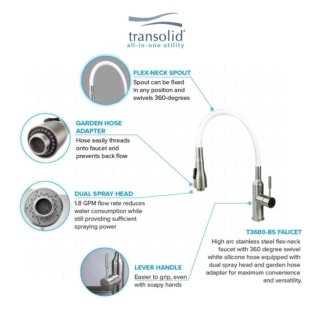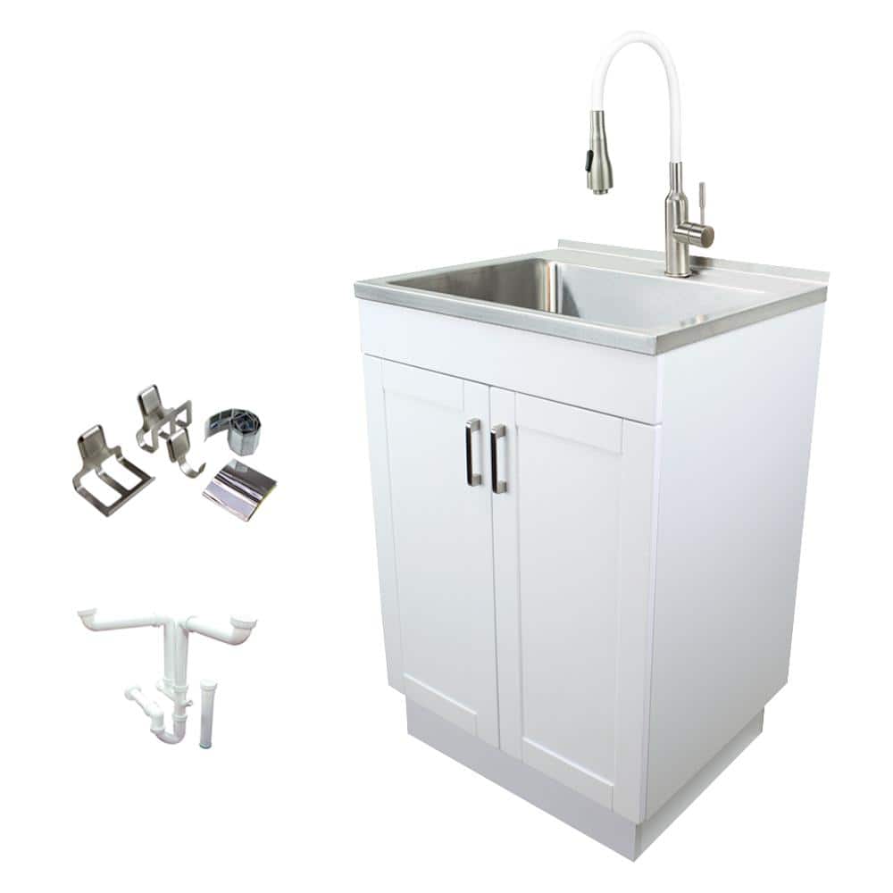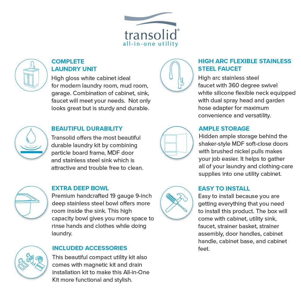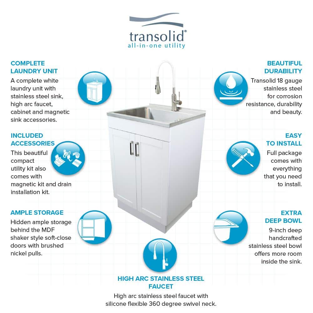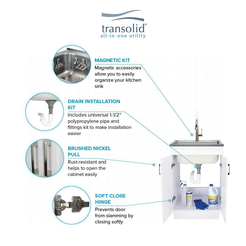 Transform your utility space with the Transolid All-in-One Utility Sink and Cabinet. This robust package features a pre-built shaker style cabinet, a spacious stainless steel sink, a multi-function faucet, and a convenient accessories kit. Perfect for laundry rooms, workshops, or garages, its stylish design and durable construction ensure both function and form.