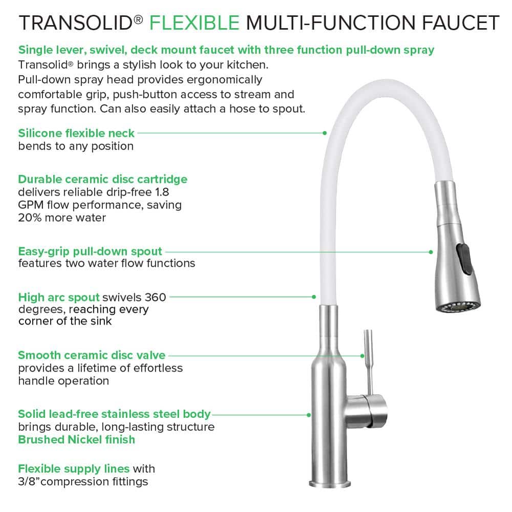 A: The faucet features a single lever handle with a flexible neck, dual function spray head, and provides a 1.8 GPM flow rate for efficient water use.