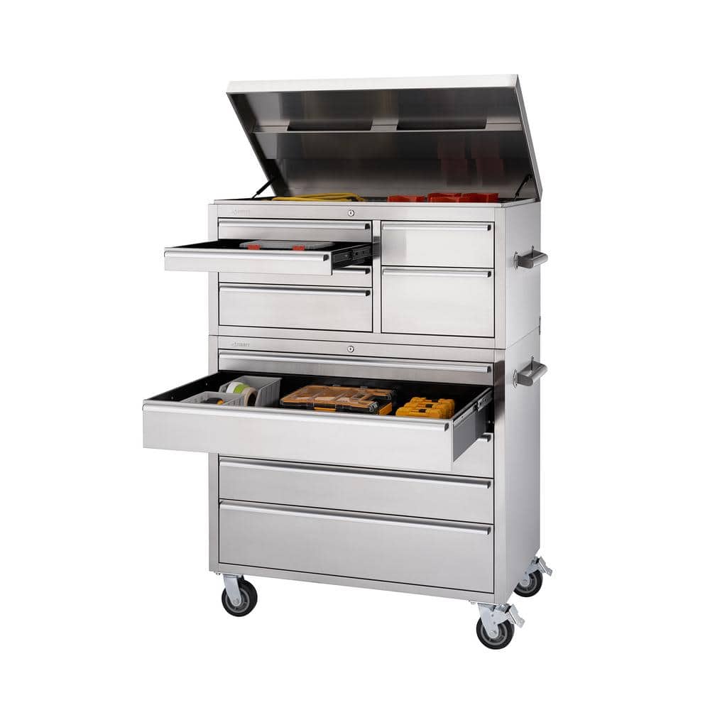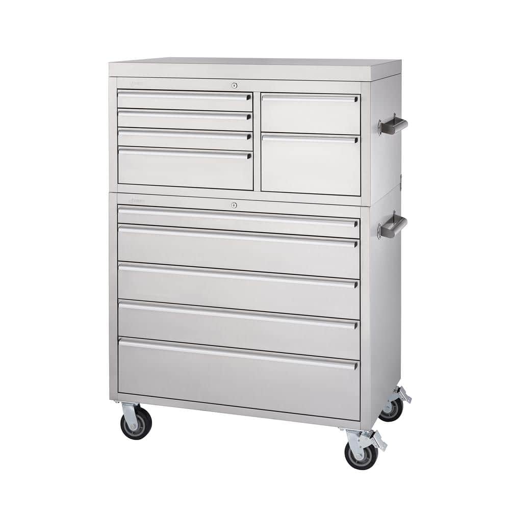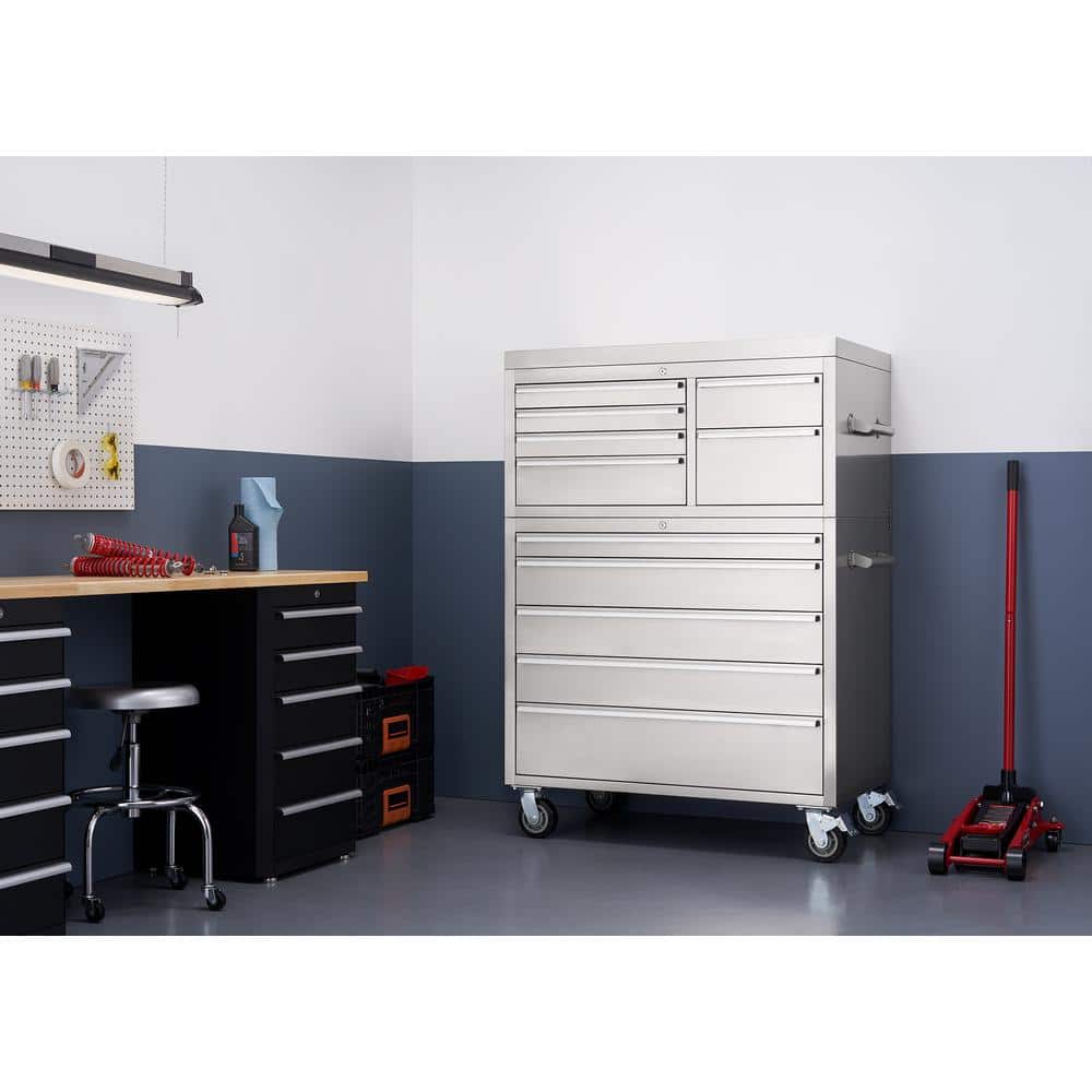 The TRINITY 43-Inch x 25-Inch Stainless Steel Rolling Tool Chest Combo offers an extensive 11-drawer layout tailored for serious tool organization. Engineered with high-quality commercial-grade stainless steel and gliding on heavy-duty wheels, it supports a total load capacity of 2,200 lbs, making it the ultimate choice for both garage and workshop environments.