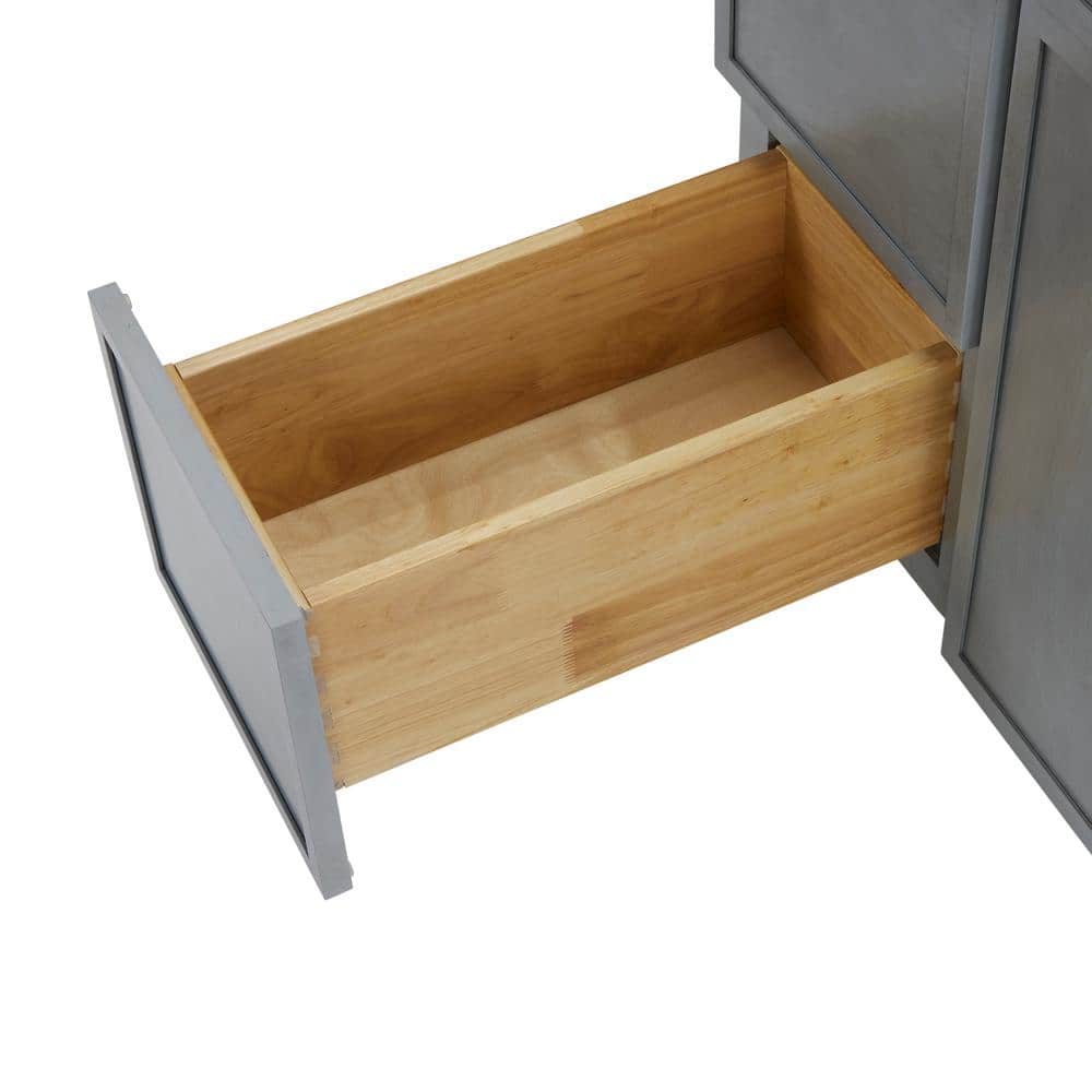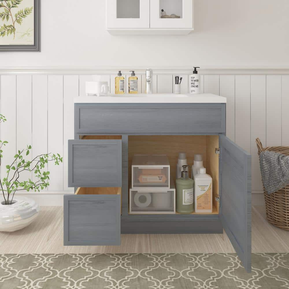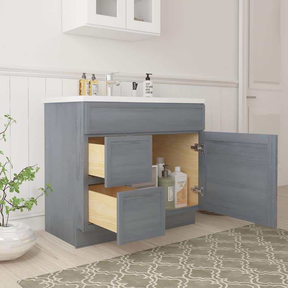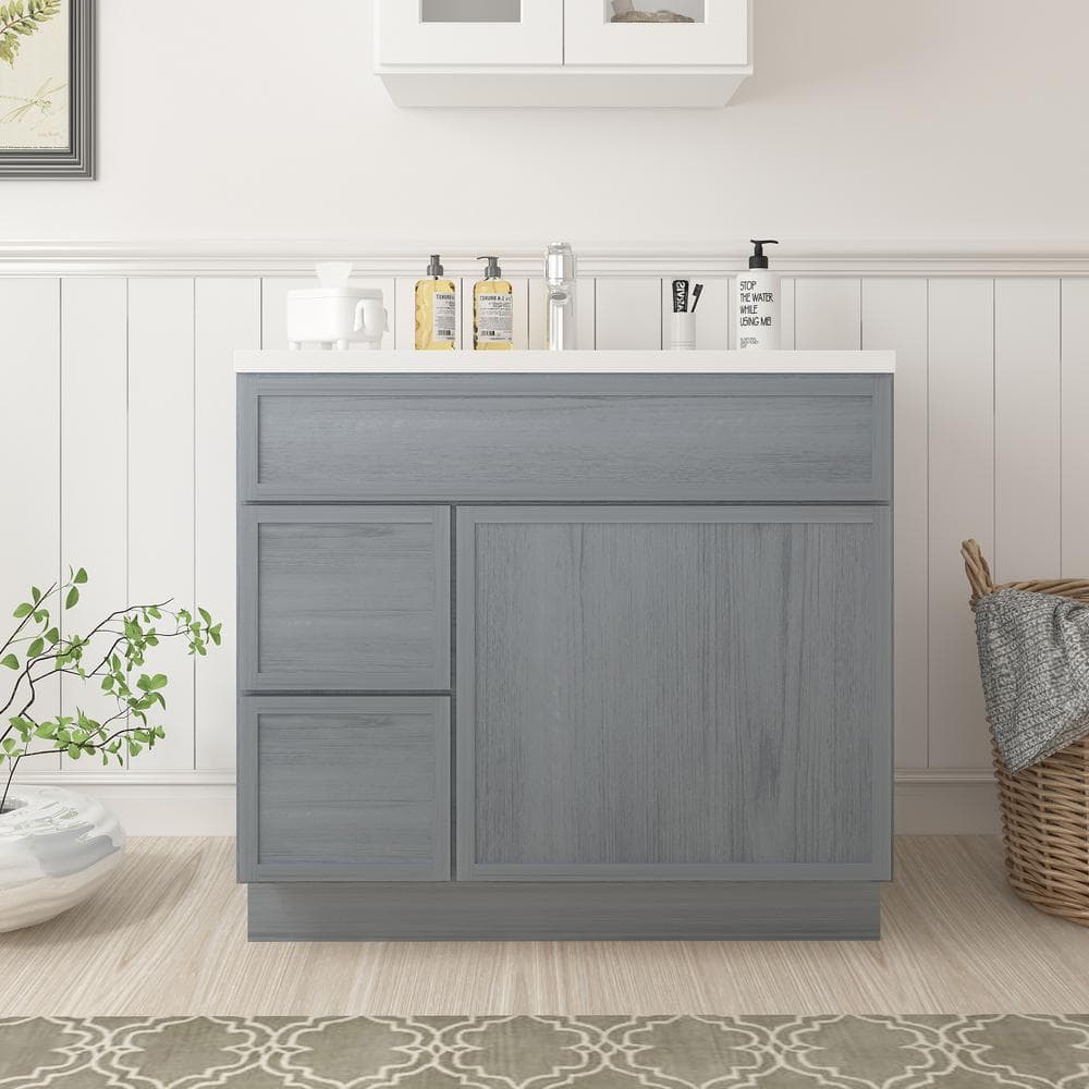 This Vanity Art 36-inch wide bathroom vanity cabinet presents a durable and stylish solution for organizing your bathroom essentials. Crafted from high-quality birch and plywood, its elegant smoky gray finish and shaker-style design create a sophisticated modern look that complements any bathroom decor.