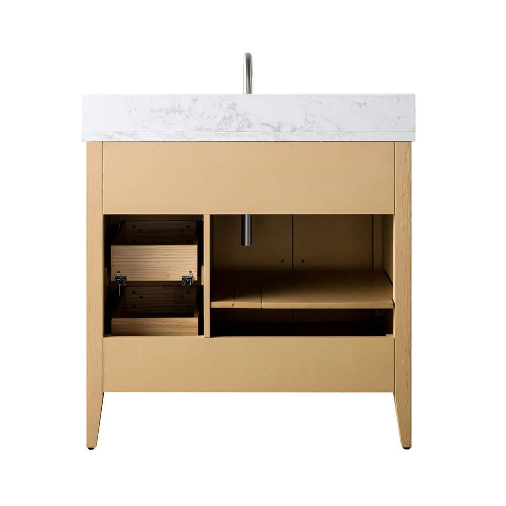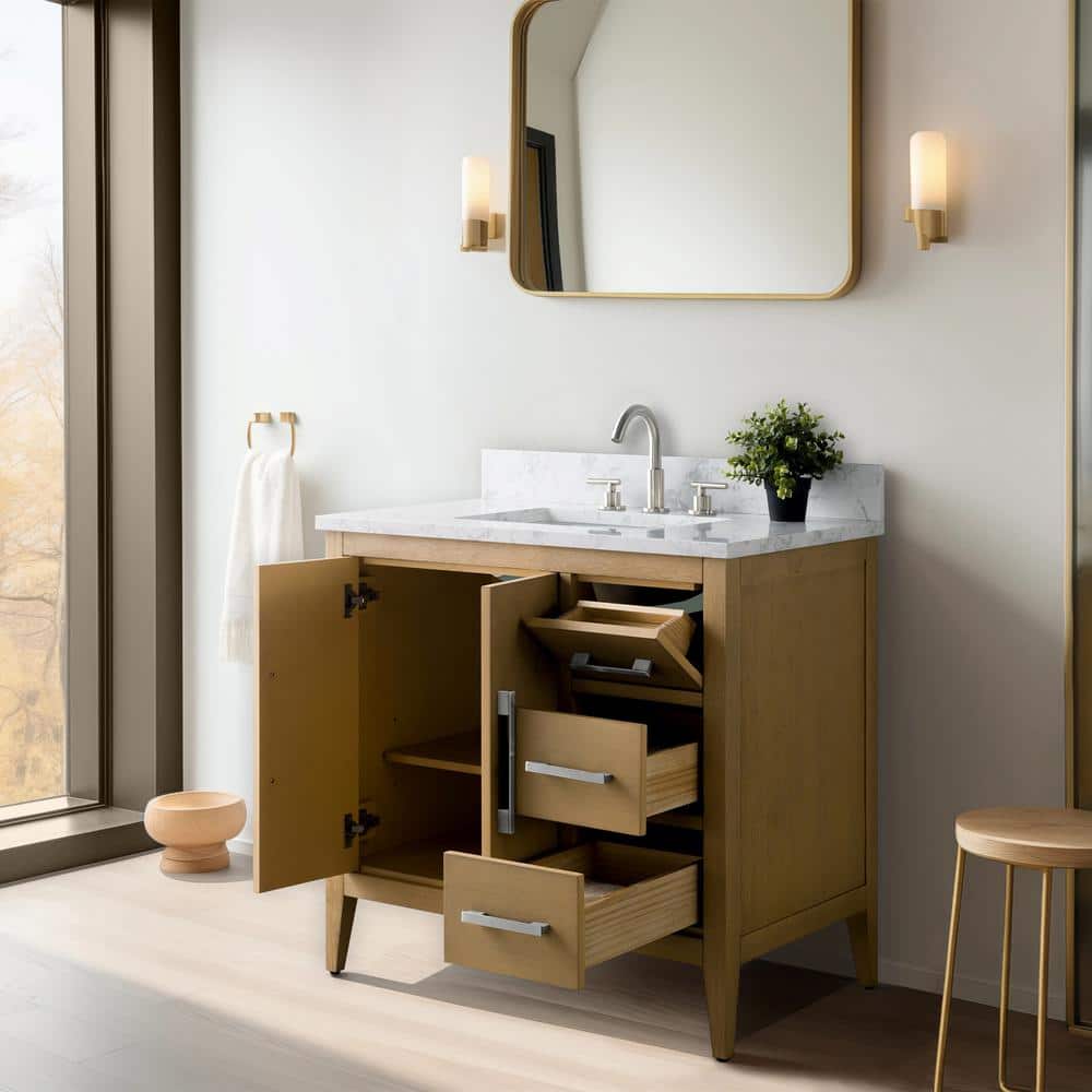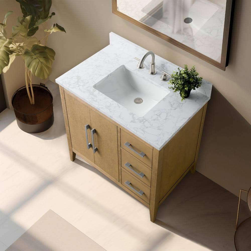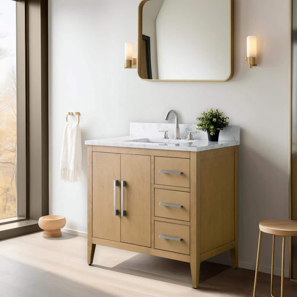 Vanity Art's 36-inch Single Sink Bathroom Vanity combines the warmth of natural oak with a sleek white engineered marble countertop, offering both style and function. This fully assembled vanity is designed for ultimate convenience with ample storage space and easy installation.