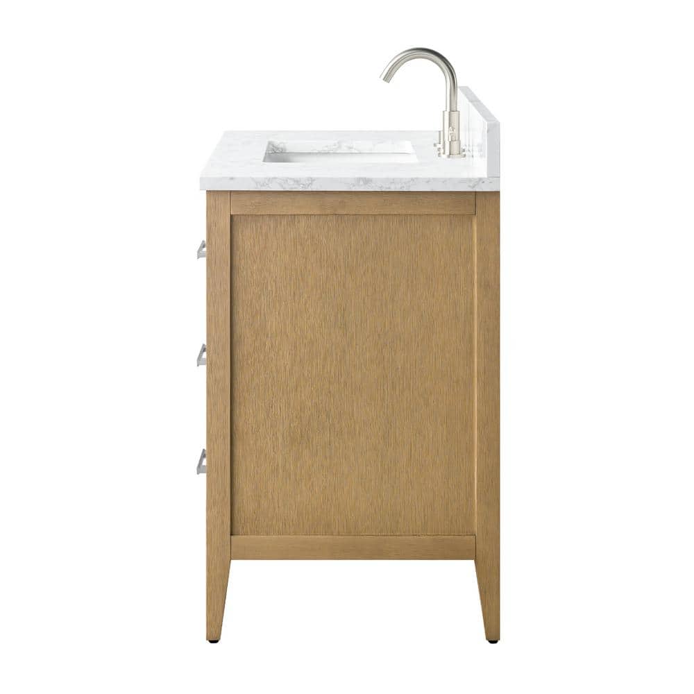 Install this vanity to witness a harmonious balance between sophisticated design and practical functionality. The striking contrast between the natural oak wood and the elegantly engineered marble top creates a bold, modern statement. Consider pairing it with matte black or brushed nickel fixtures to amplify its chic aesthetic. A perfect addition to elevate your bathroom's design narrative, this vanity promises refined living with a whisper of luxury.
