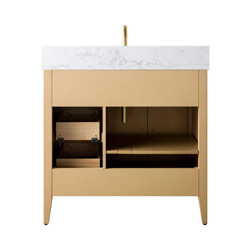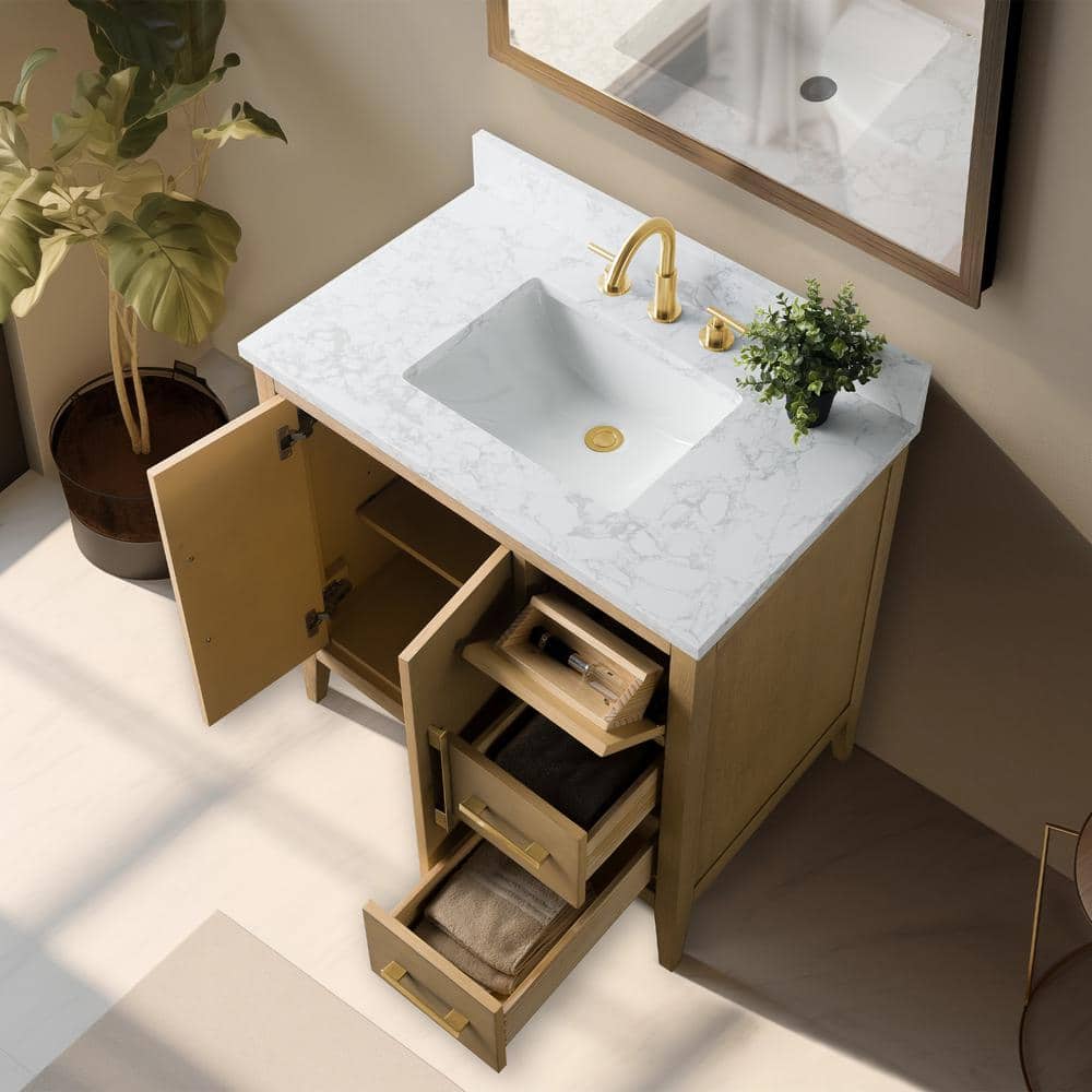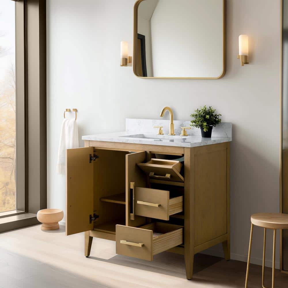 Enhance your bathroom with the 36-inch Vanity Art Bathroom Vanity, combining a Natural Oak finish with an Arabescato White engineered marble top. This elegant, freestanding piece is fully assembled, featuring smooth operation and generous storage, making organization simple and stylish.