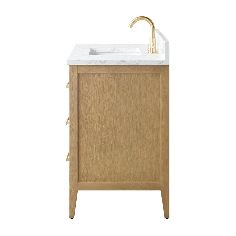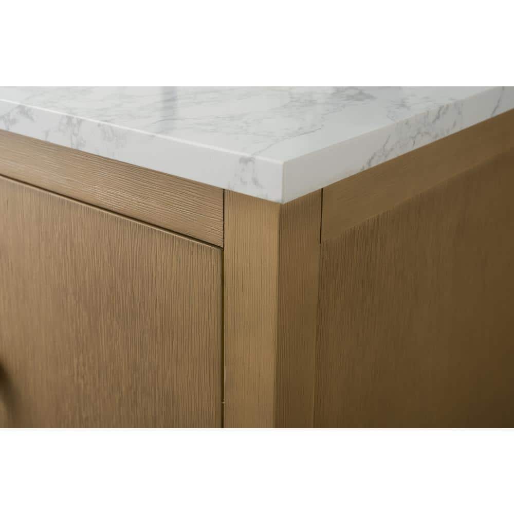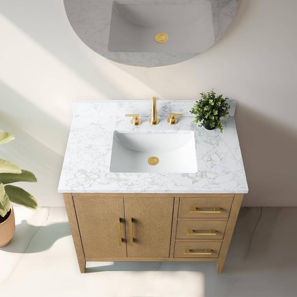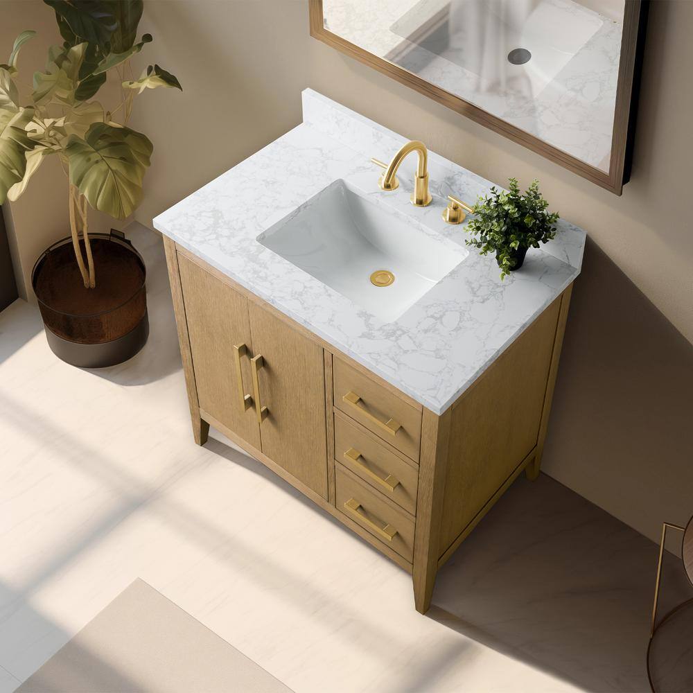 Enhance your bathroom with the 36-inch Vanity Art Bathroom Vanity, combining a Natural Oak finish with an Arabescato White engineered marble top. This elegant, freestanding piece is fully assembled, featuring smooth operation and generous storage, making organization simple and stylish.