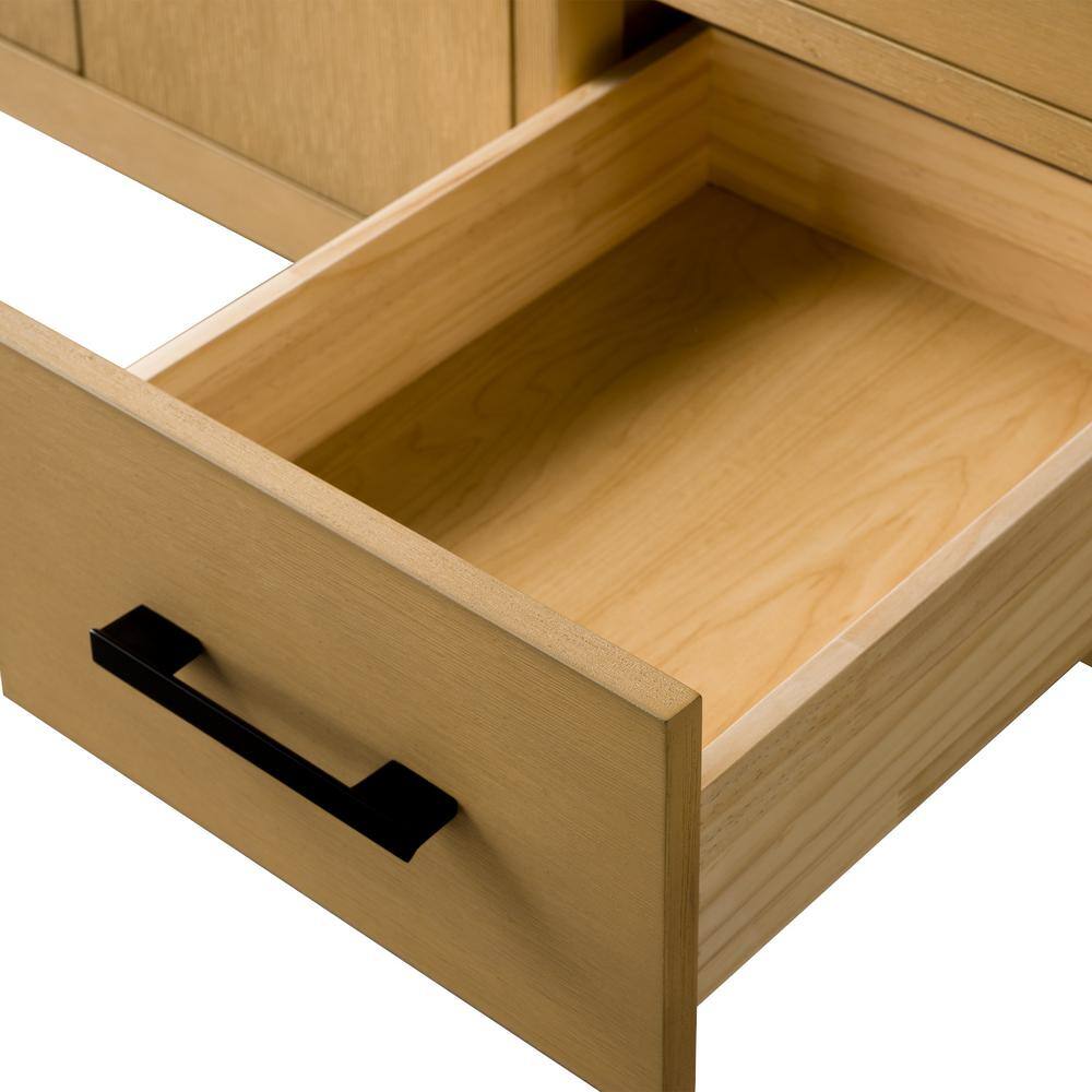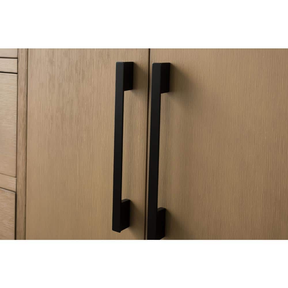 • Modern Hardware: Matte black fixtures elegantly contrast with the natural oak finish, creating a chic look.