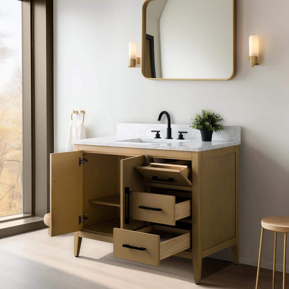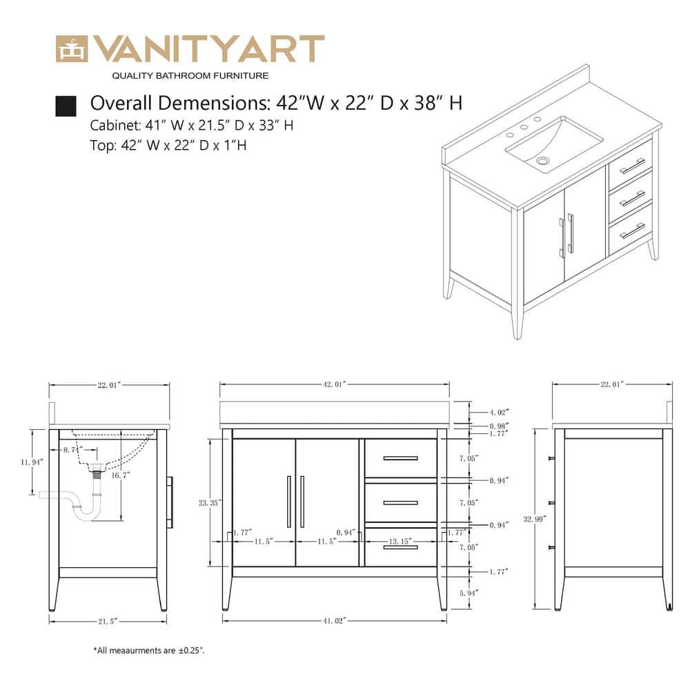 The Vanity Art 42-inch Single Sink Bathroom Vanity perfectly combines elegance with practicality, offering ample storage and a stunning Arabescato White engineered marble top. Designed for ease and style, it's an ideal choice for both professionals and DIY enthusiasts seeking a modern, sophisticated bathroom upgrade.