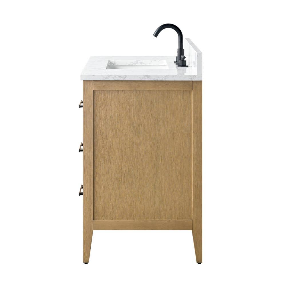 Allow this refined bathroom vanity to become the centerpiece of your sanctuary, as its Natural Oak finish and opulent Arabescato marble top introduce a harmonious blend of warmth and luxury. The sleek matte black hardware punctuates its classic charm, adding a touch of contemporary flair. Style it with minimal, elegant accessories to highlight its understated beauty, and experience the seamless fusion of aesthetics and utility. This vanity isn't just a piece of furniture; it's an investment in a more exquisite everyday life.