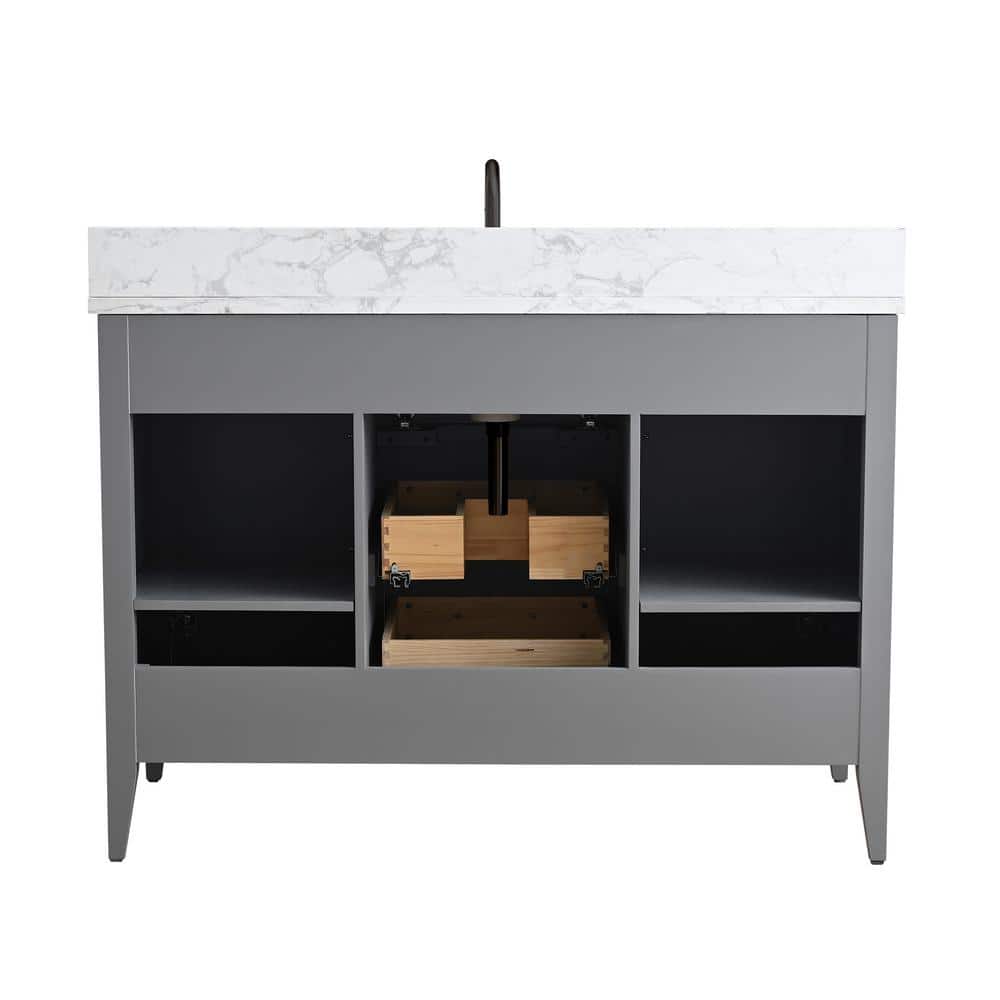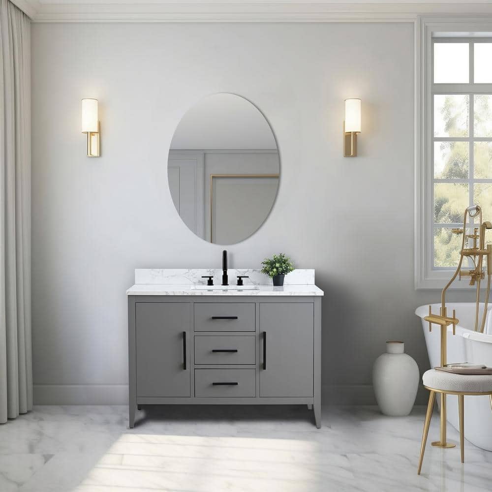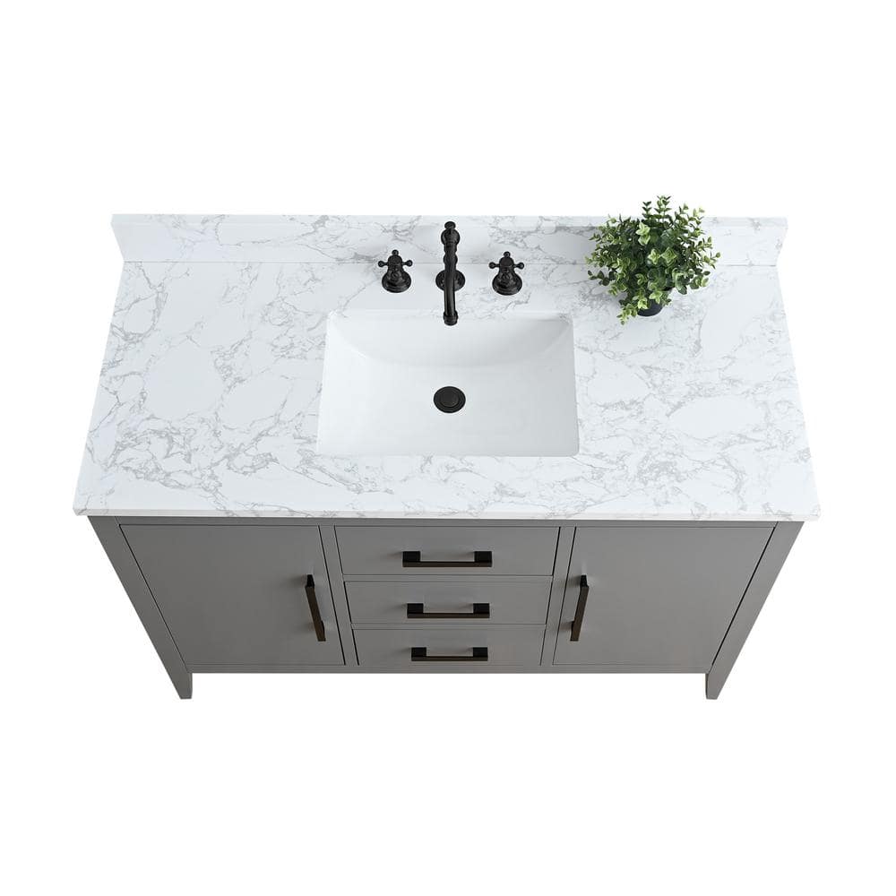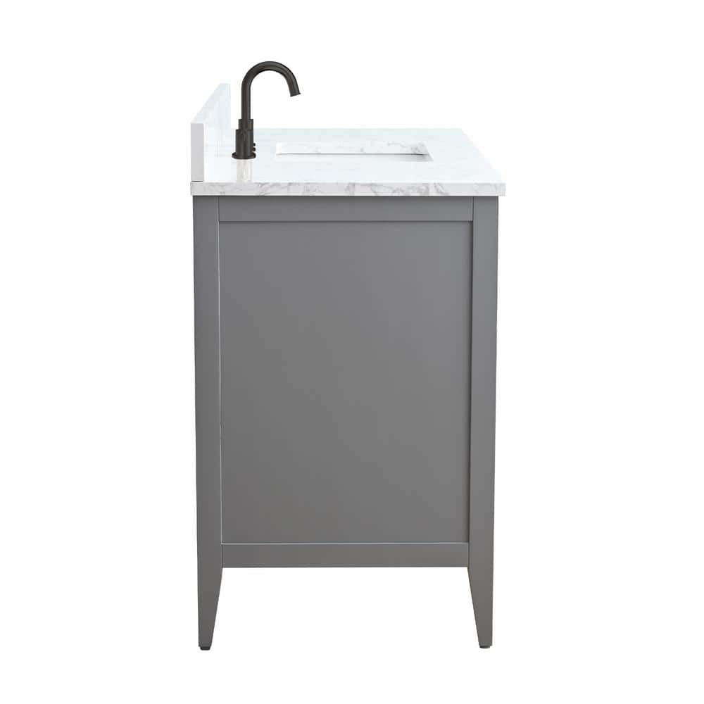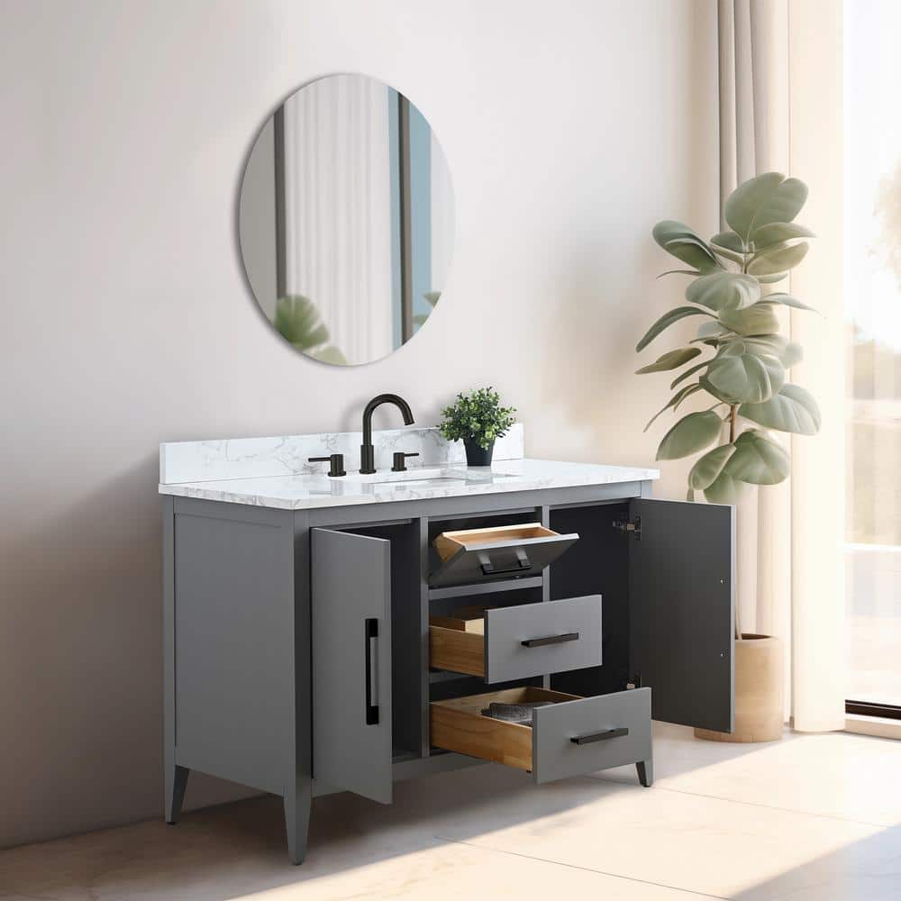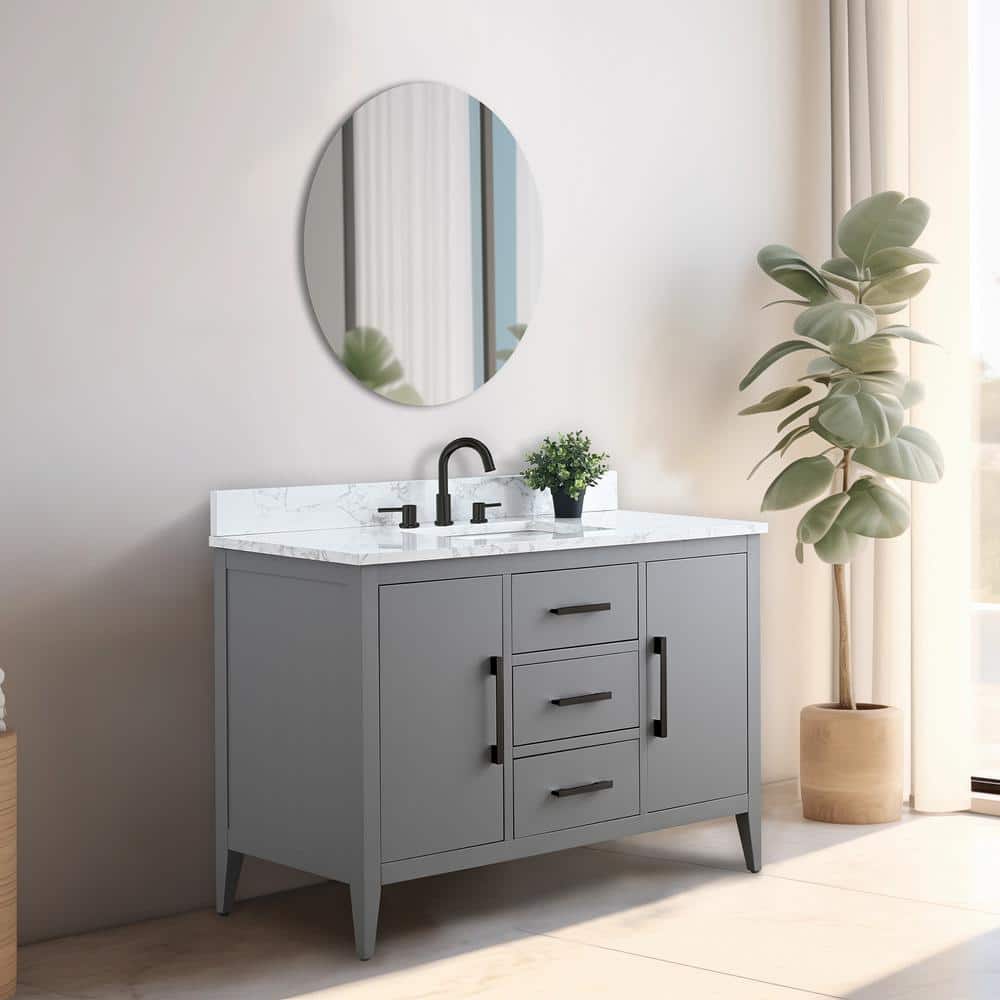 The Vanity Art 48-inch Cashmere Gray Bathroom Vanity is a perfect blend of sophistication and utility. Constructed from high-quality MDF with an engineered marble top, this vanity offers ample storage and a stunning Arabescato white countertop that’s easy to clean. The freestanding design includes premium hardware and smooth, soft-closing mechanisms, making it an elegant focal point for any bathroom.