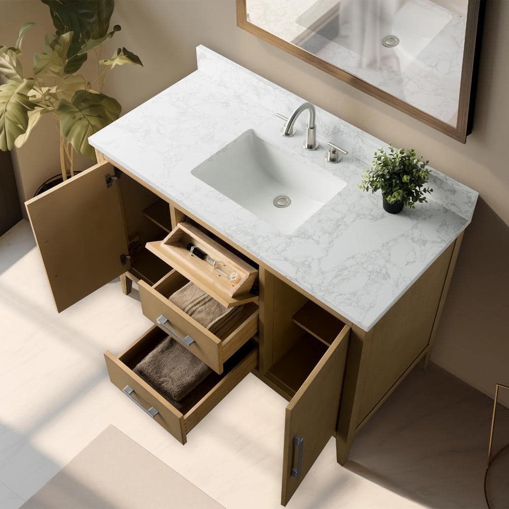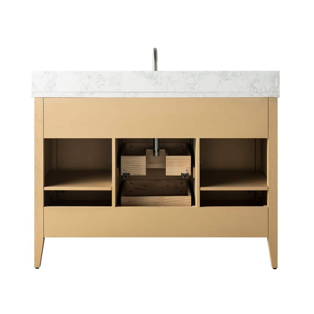 Elevate your bathroom space with Vanity Art's elegant 48-inch single sink vanity cabinet, crafted in Natural Oak and topped with sleek engineered white marble. Offering style and functionality, it features spacious storage with adjustable shelves and a sophisticated design, perfect for enhancing any bathroom.