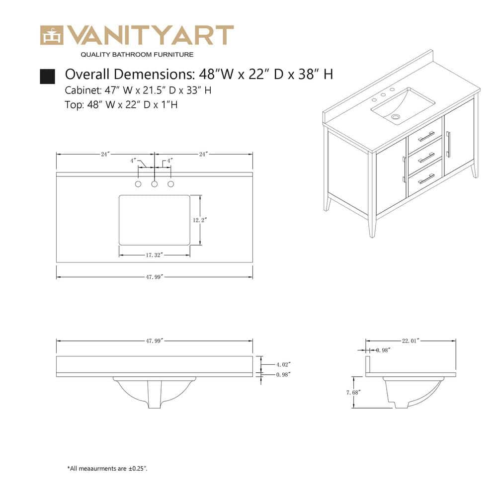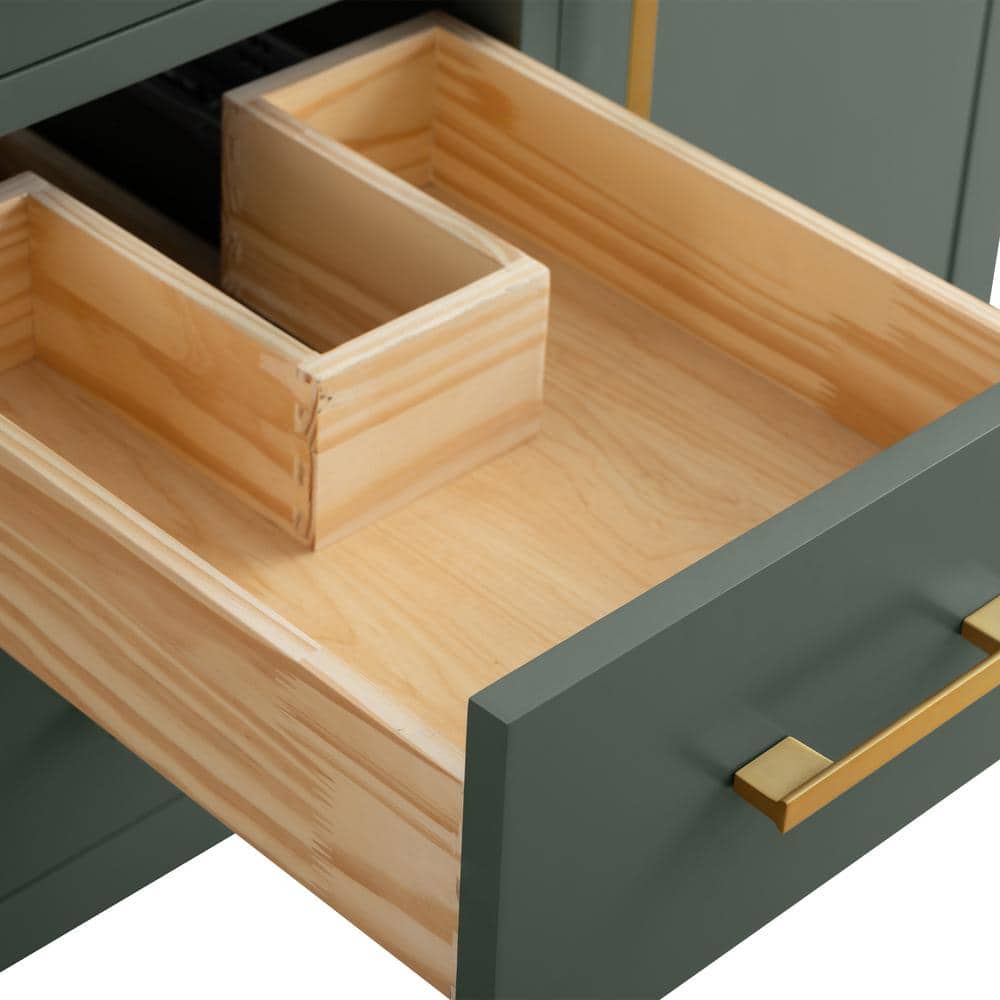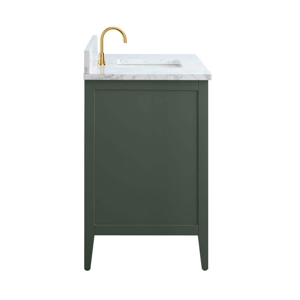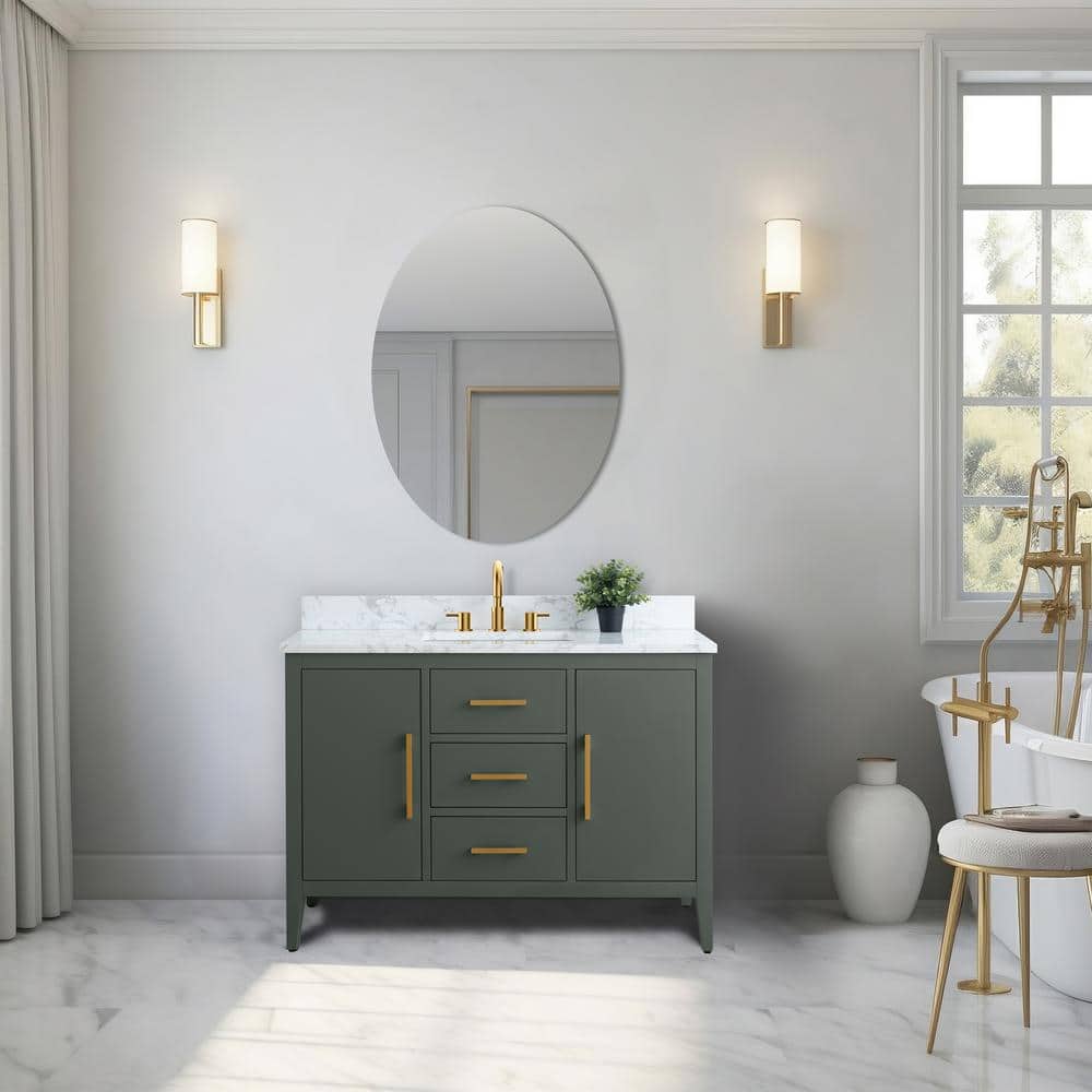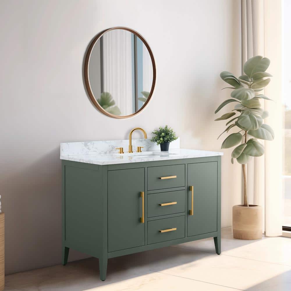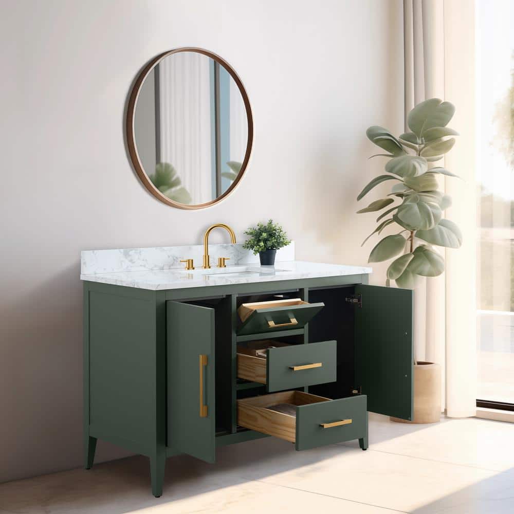 The Vanity Art 48-inch Single Sink Bathroom Vanity in Vintage Green combines style and function, featuring a stunning engineered marble top. With its ample storage and sleek, easy-to-clean surface, this vanity offers a chic and practical upgrade for any bathroom.