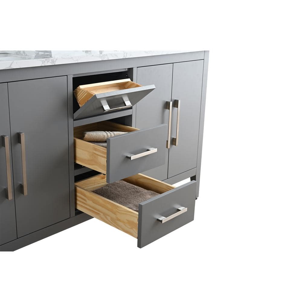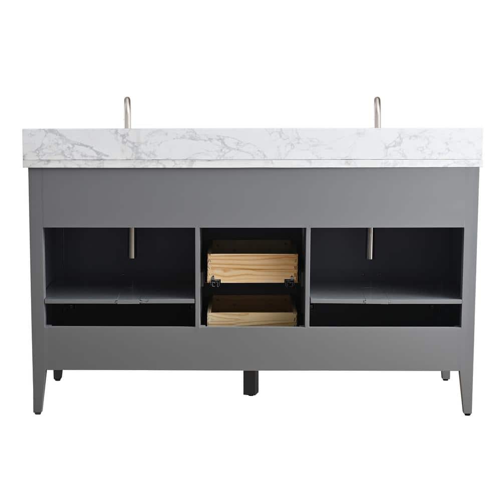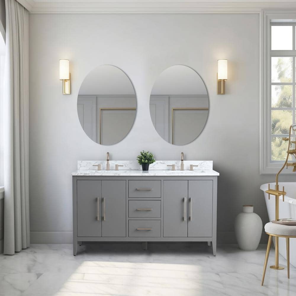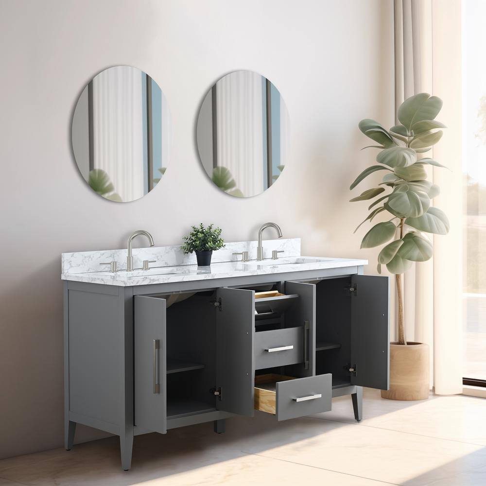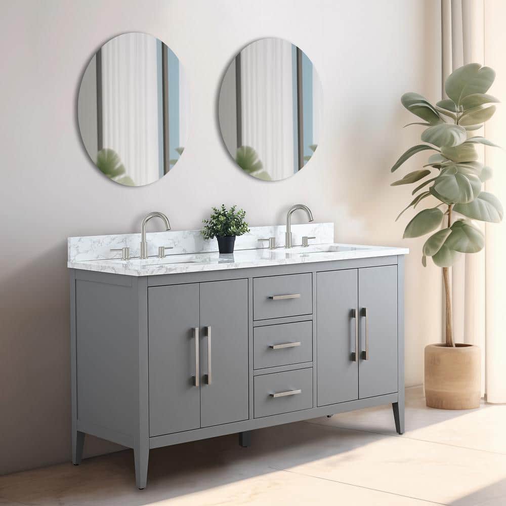 The Vanity Art 60 in. Double Sink Bathroom Vanity seamlessly combines functionality and style with its generous storage and eye-catching design. Featuring a Cashmere Gray cabinet with a luxurious Arabescato White engineered marble top, this piece is as practical as it is elegant, making it a stellar centerpiece for any contemporary bathroom.