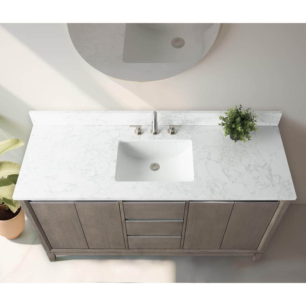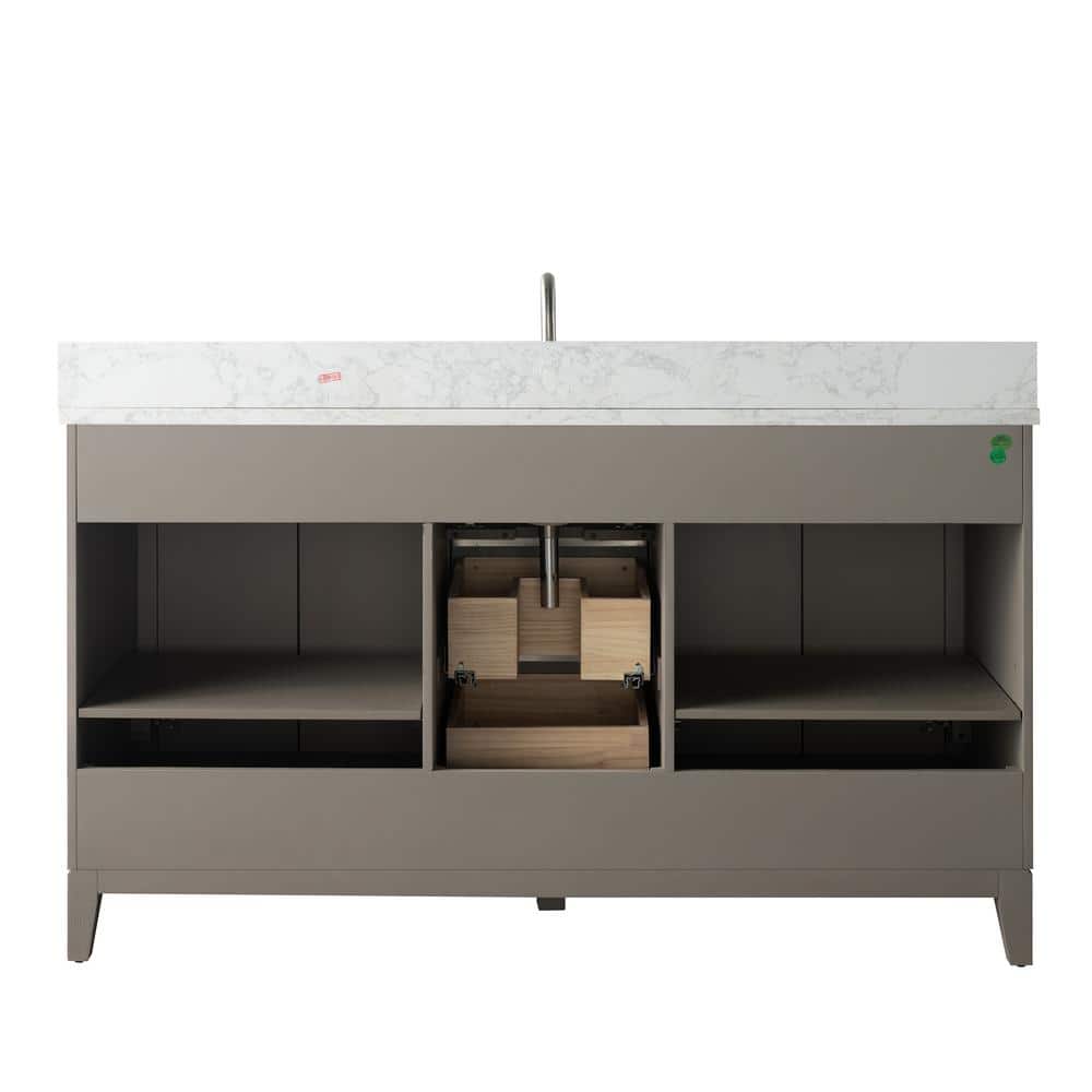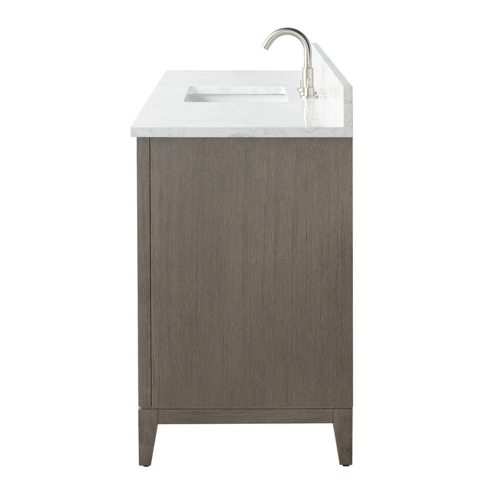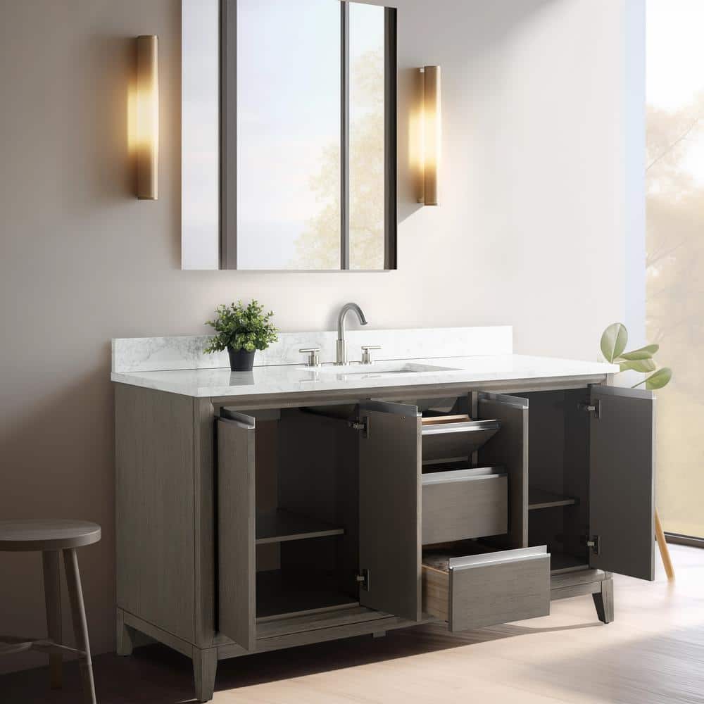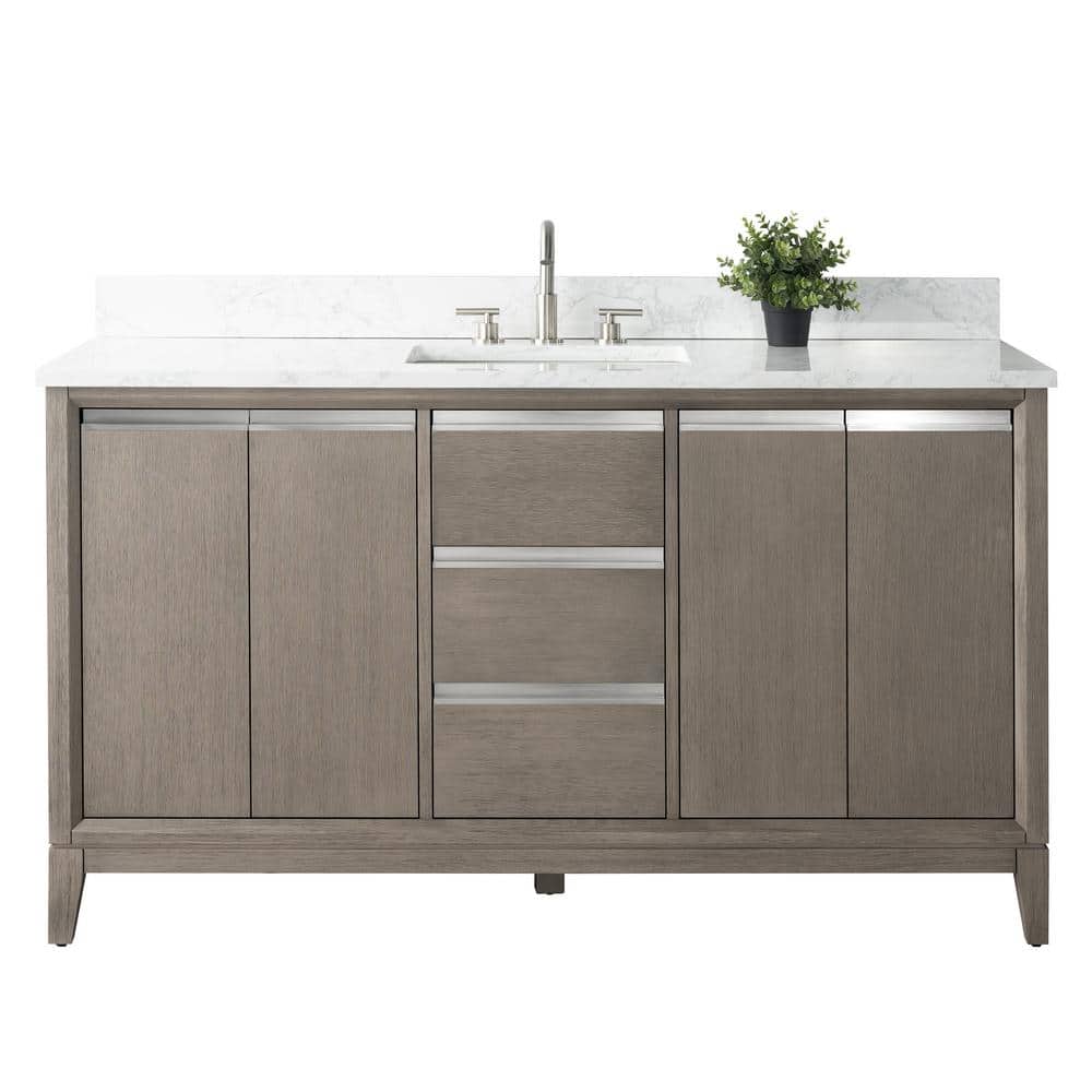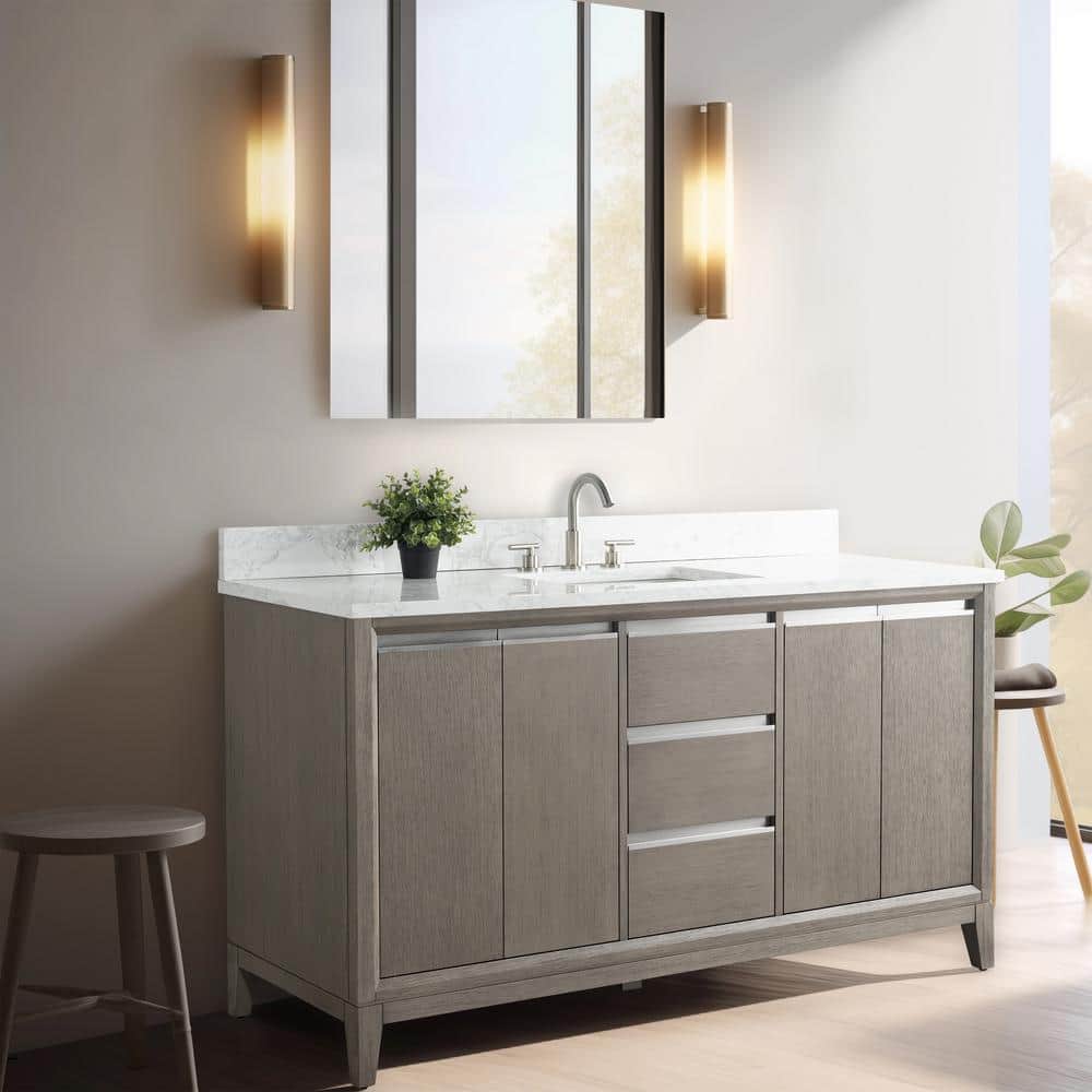The Vanity Art 60-inch Single Sink Bathroom Vanity combines timeless elegance and modern functionality with its Driftwood Gray finish and pristine engineered marble top. Ideal for a stylish bathroom makeover, this vanity offers ample storage with its well-designed drawers and adjustable shelves, ensuring an organized space without compromising on aesthetics.