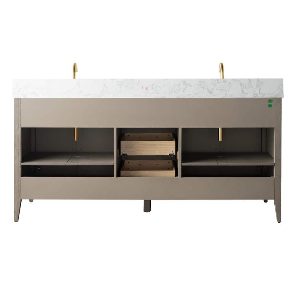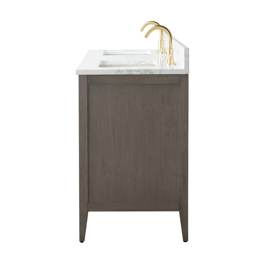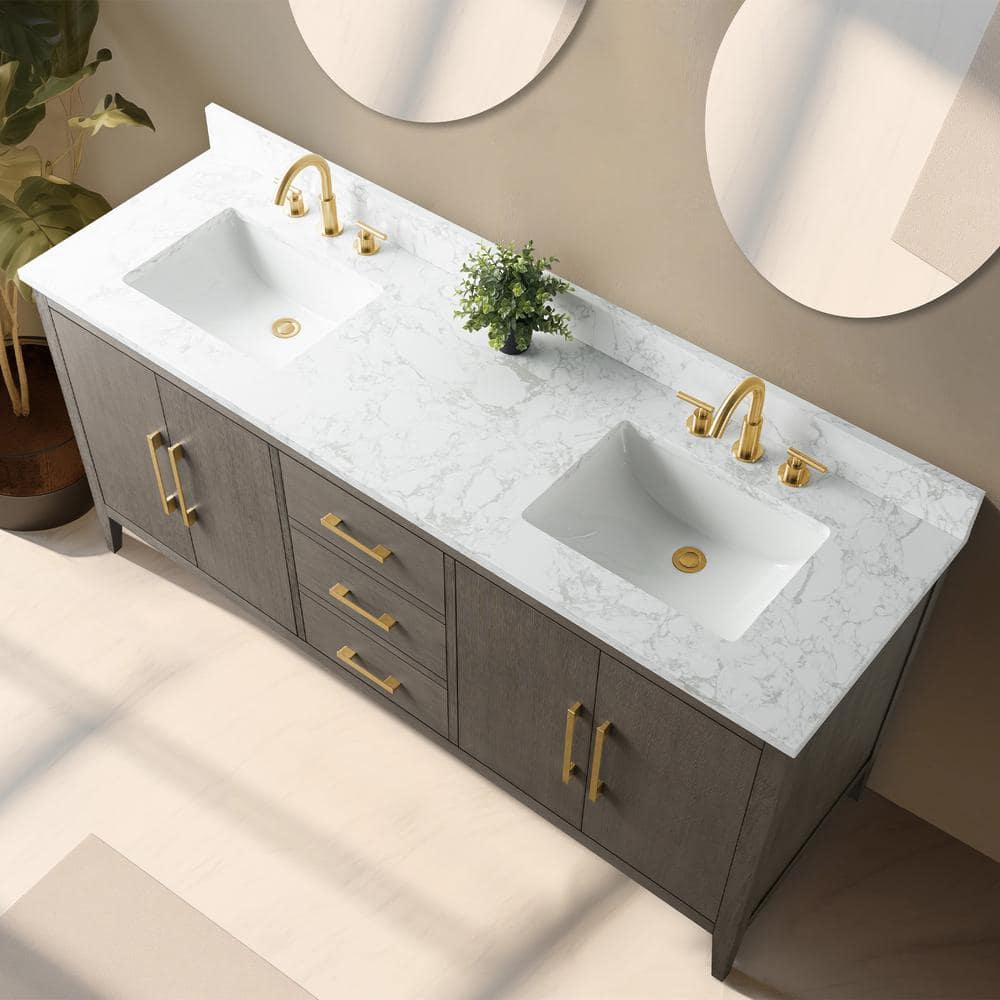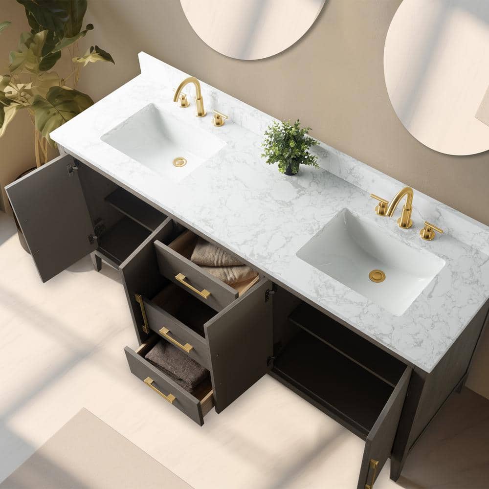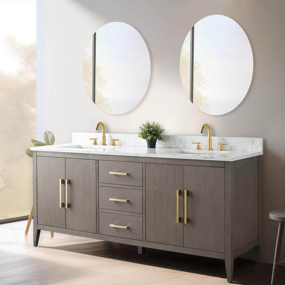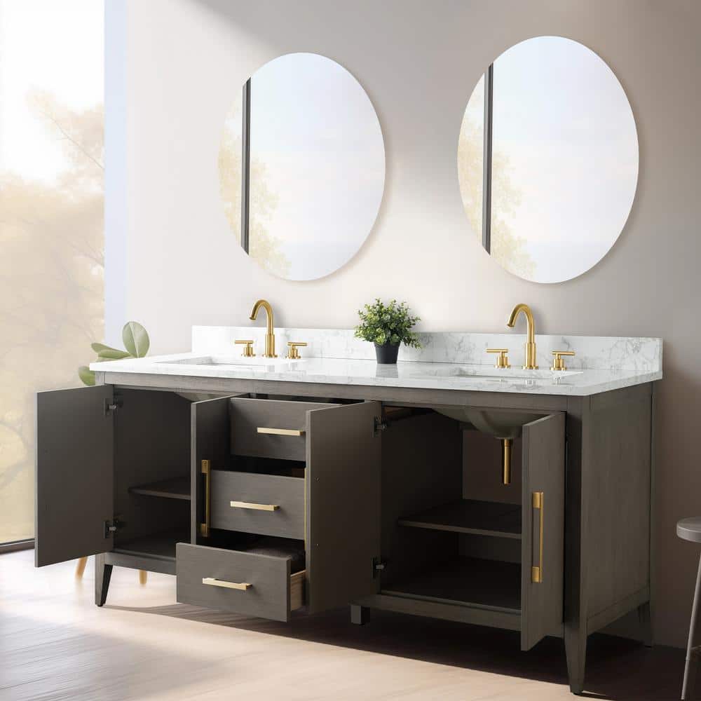 Transform your bathroom with the sophisticated Vanity Art 72" Double Sink Bath Vanity in Driftwood Gray. Featuring a stunning Arabescato White engineered marble top, this freestanding piece combines effortless style with remarkable functionality, boasting ample storage and elegant design details.