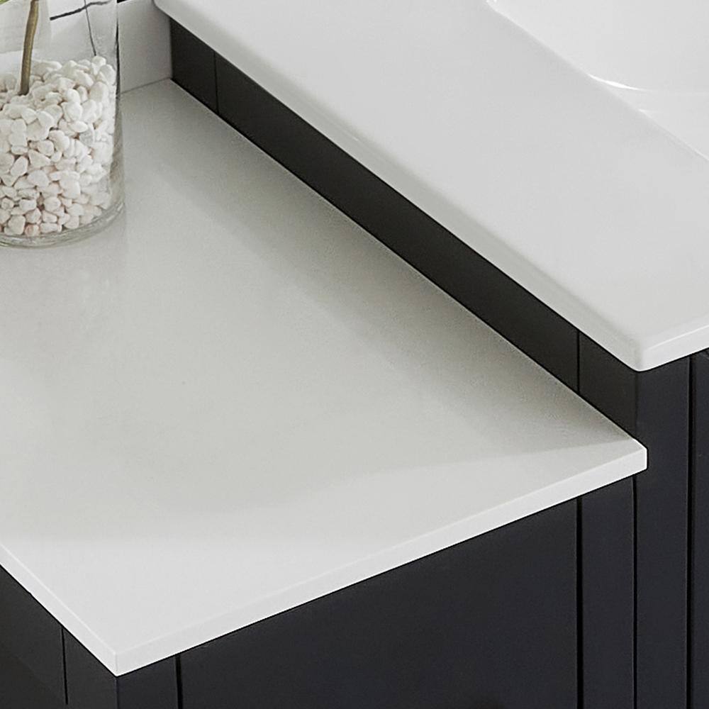 A: The vanity is crafted from moisture-resistant solid and manufactured wood, topped with a ceramic surface.