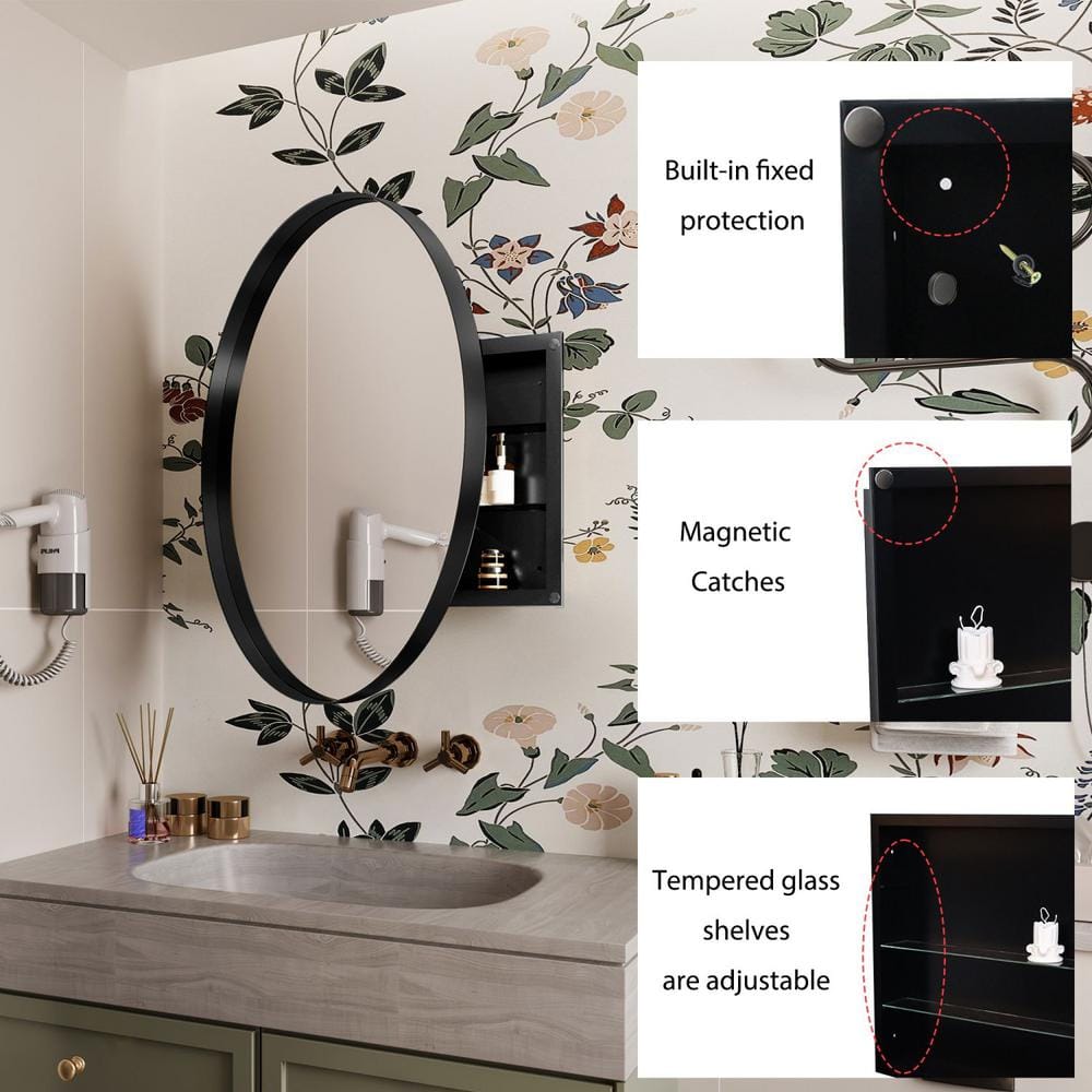 Matte Black Round Medicine Cabinet with Mirror