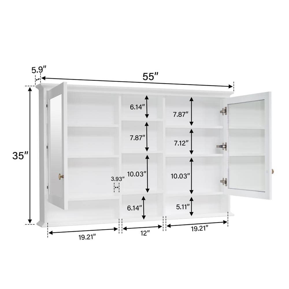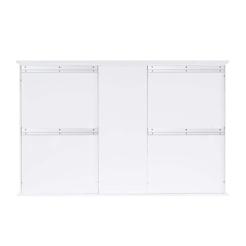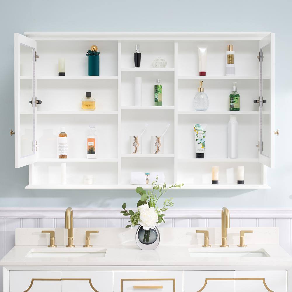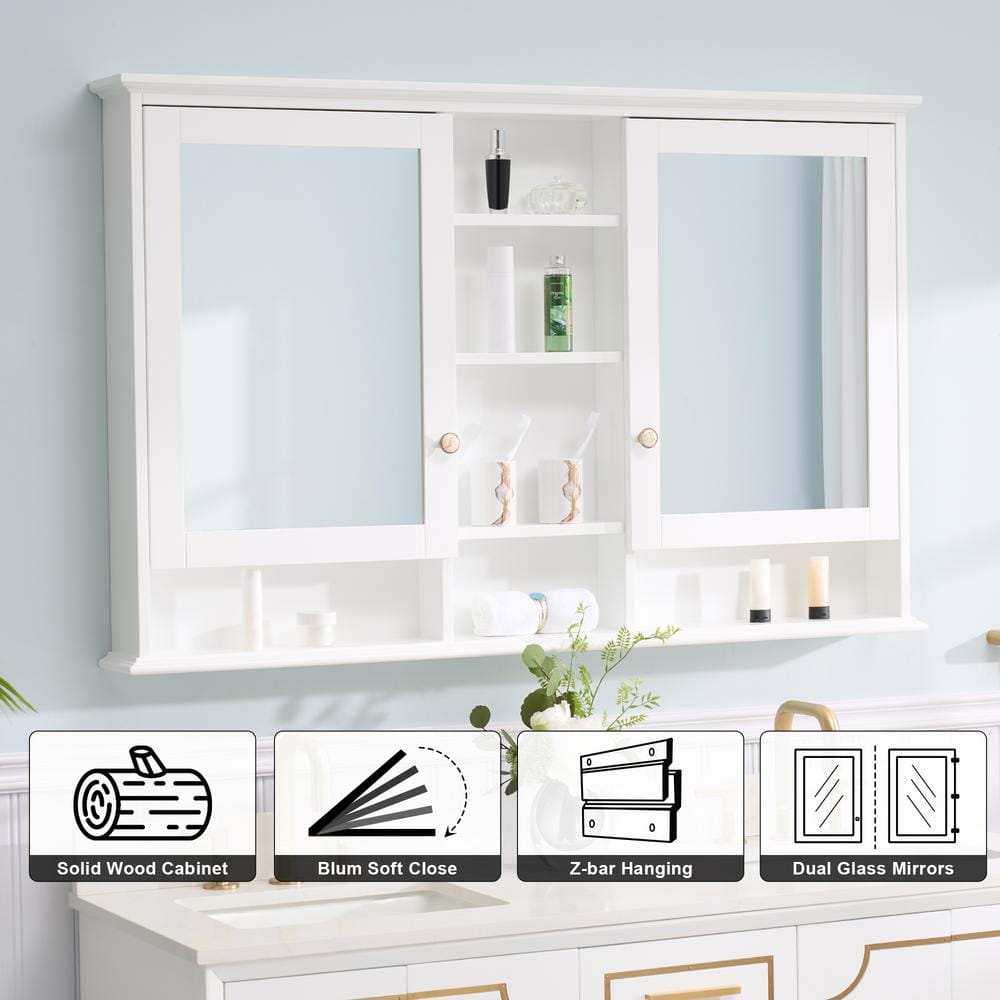 WELLFOR 55 in. W x 35 in. H Rectangular White Wood Surface Mount Medicine Cabinet with Mirror and Shelves, 2-Soft Close Doors