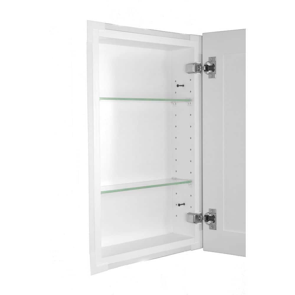 The WG Wood Products White Enamel Recessed Medicine Cabinet seamlessly integrates stylish design with practical functionality. It features a frameless Shaker-style door made of solid maple and fits perfectly within standard 2x4 walls. Effortlessly enhance your bathroom's aesthetic while benefiting from the durable construction and soft-close technology to prevent slamming doors.