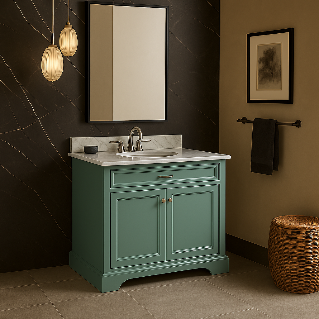 Elevate your bathroom's aesthetic with this exquisite vanity, blending timeless design with modern functionality. The sea green finish and brushed nickel hardware create a harmonious balance of color and texture, while the Carrara marble top adds a touch of luxury. Style it with a matching mirror and soft lighting to complete the look. This piece is not just a vanity; it's a statement of refined taste and practical elegance.