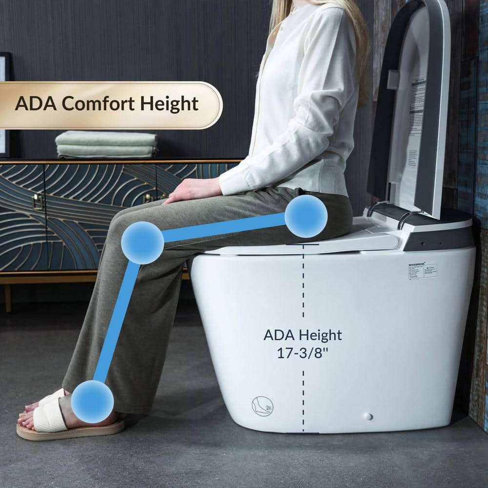 The WOODBRIDGE Elongated ADA Smart Bidet Toilet in Grey combines modern design with multi-functional convenience. It features automatic open/close, dual-depth MAP flushing, and a hygienic bidet system, offering comfort and efficiency for any bathroom.