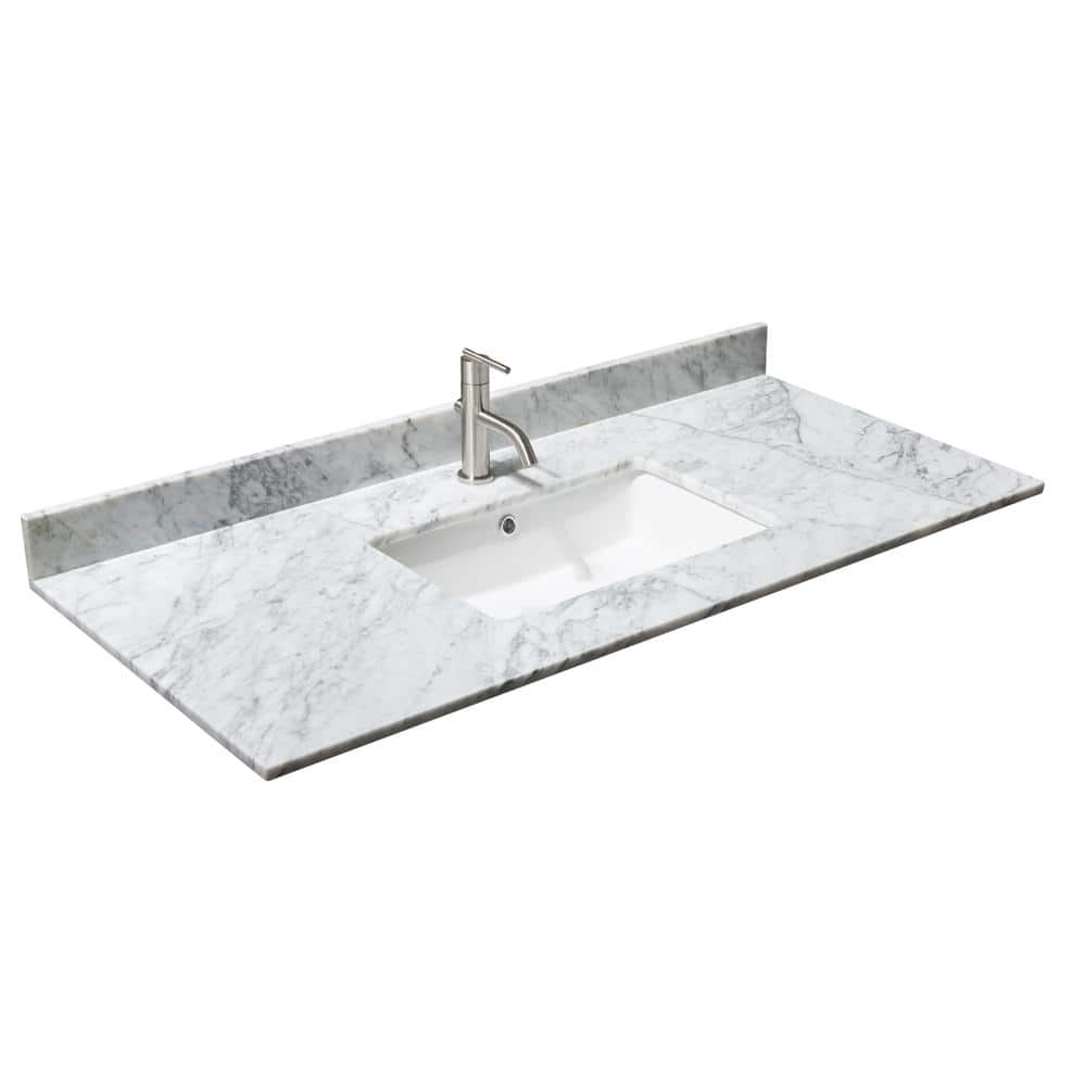The Wyndham Collection 48-inch marble vanity top combines timeless elegance with modern functionality. Featuring a white Carrara marble surface and an undermount porcelain sink, it adds sophistication to any bathroom.