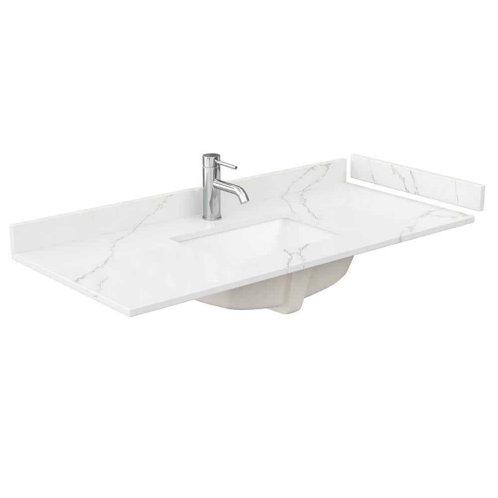 The Wyndham Collection 48-inch Quartz White Vanity Top combines elegance and functionality. Featuring a Giotto quartz surface and an undermount rectangular sink, it includes a backsplash and sidesplash for a complete look.