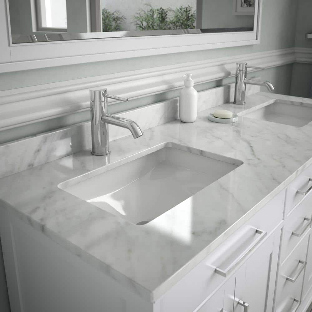 Transform your bathroom into a sanctuary of sophistication with the Wyndham Collection Marble Vanity Top. The natural white Carrara marble exudes luxury, while the double basin design offers practicality for shared spaces. Pair it with sleek chrome fixtures to enhance its modern appeal. This piece is a testament to refined taste and functional beauty, making it a must-have for any upscale bathroom.
