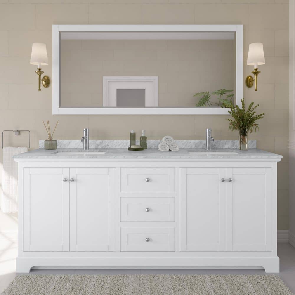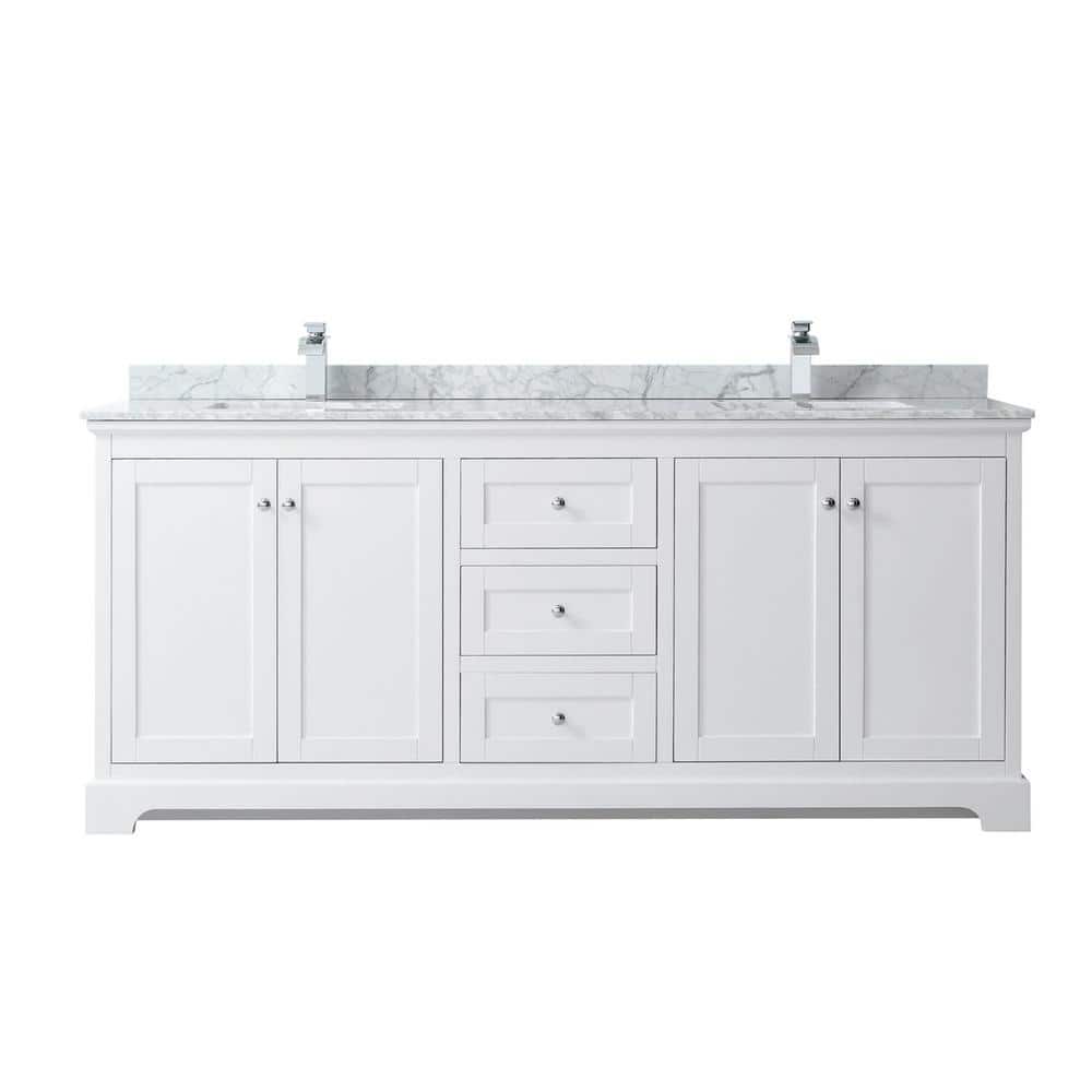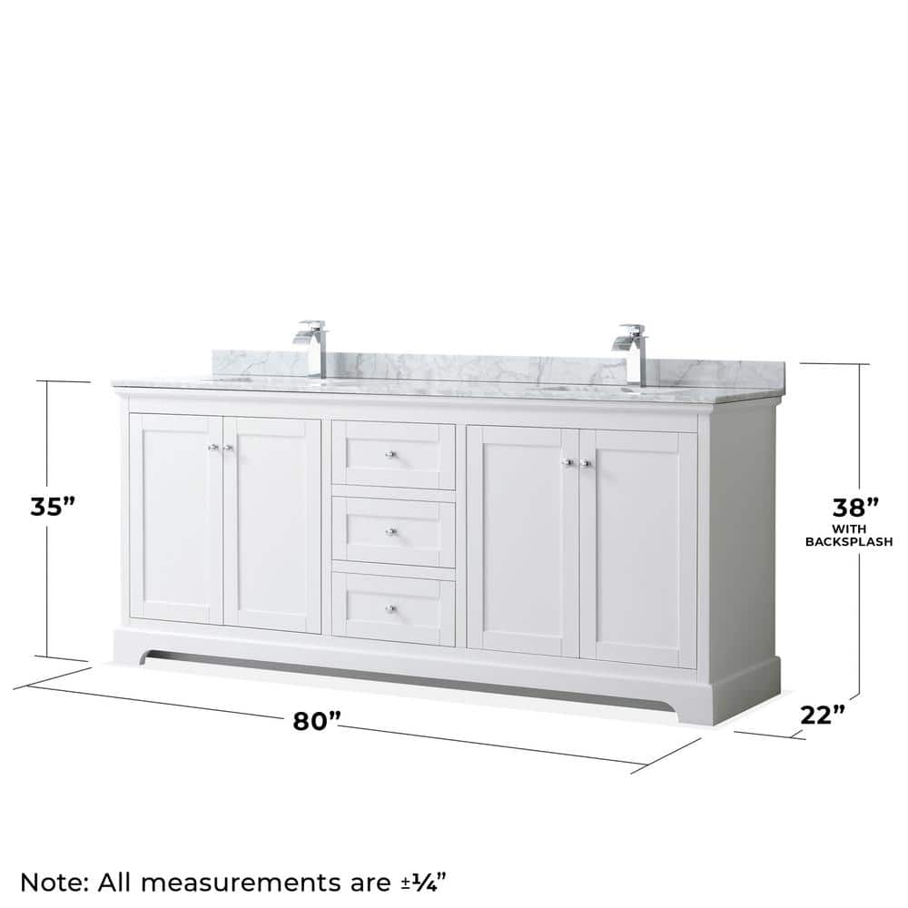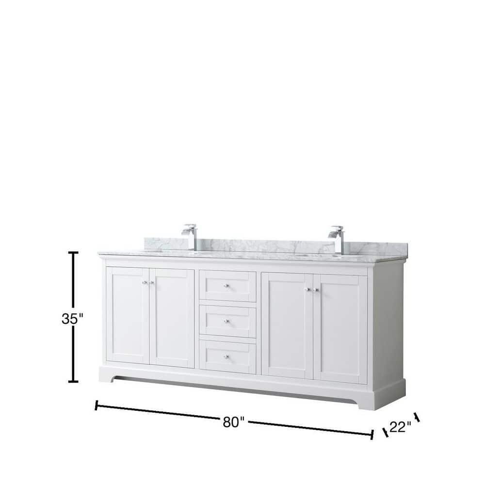 The Wyndham Collection Avery 80 in. Bathroom Vanity combines American contemporary and European classic design. Featuring a white Carrara marble top, double sinks, and ample storage, it is a perfect centerpiece for any bathroom remodel.