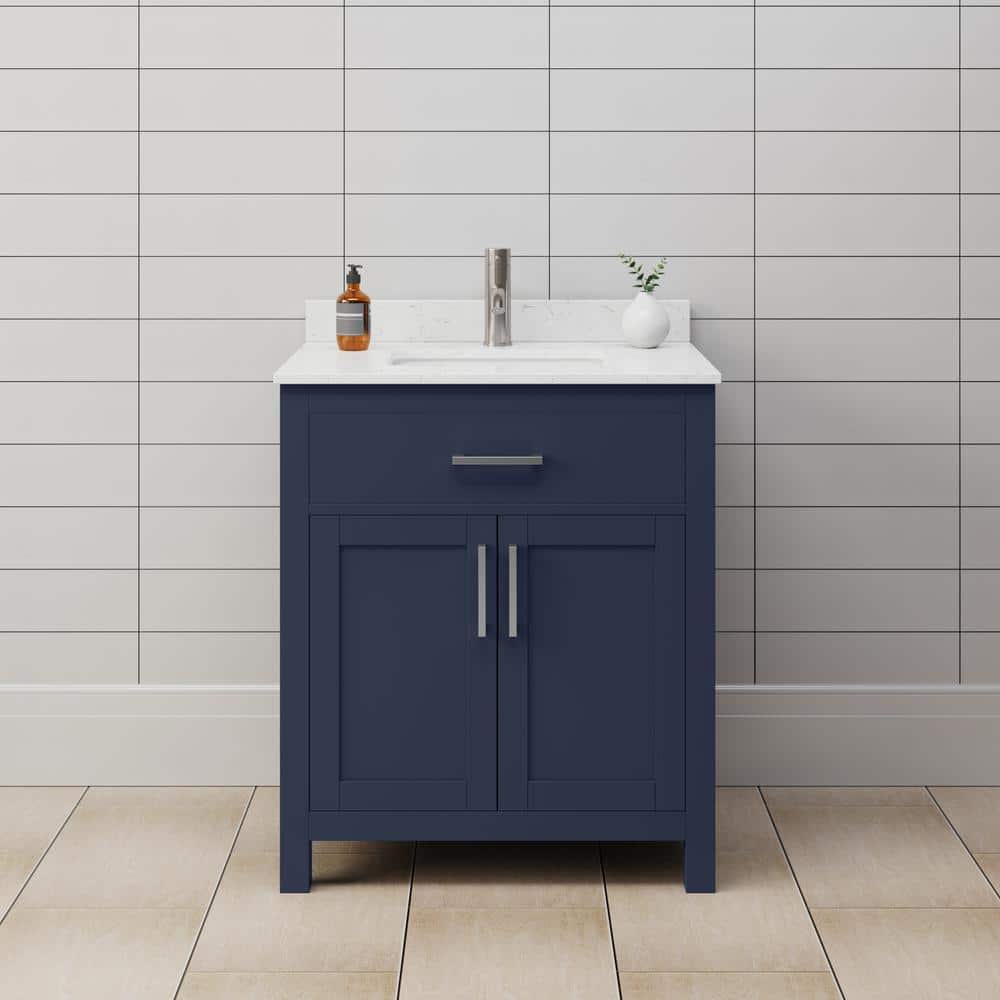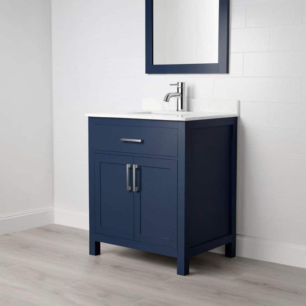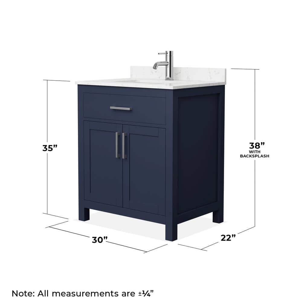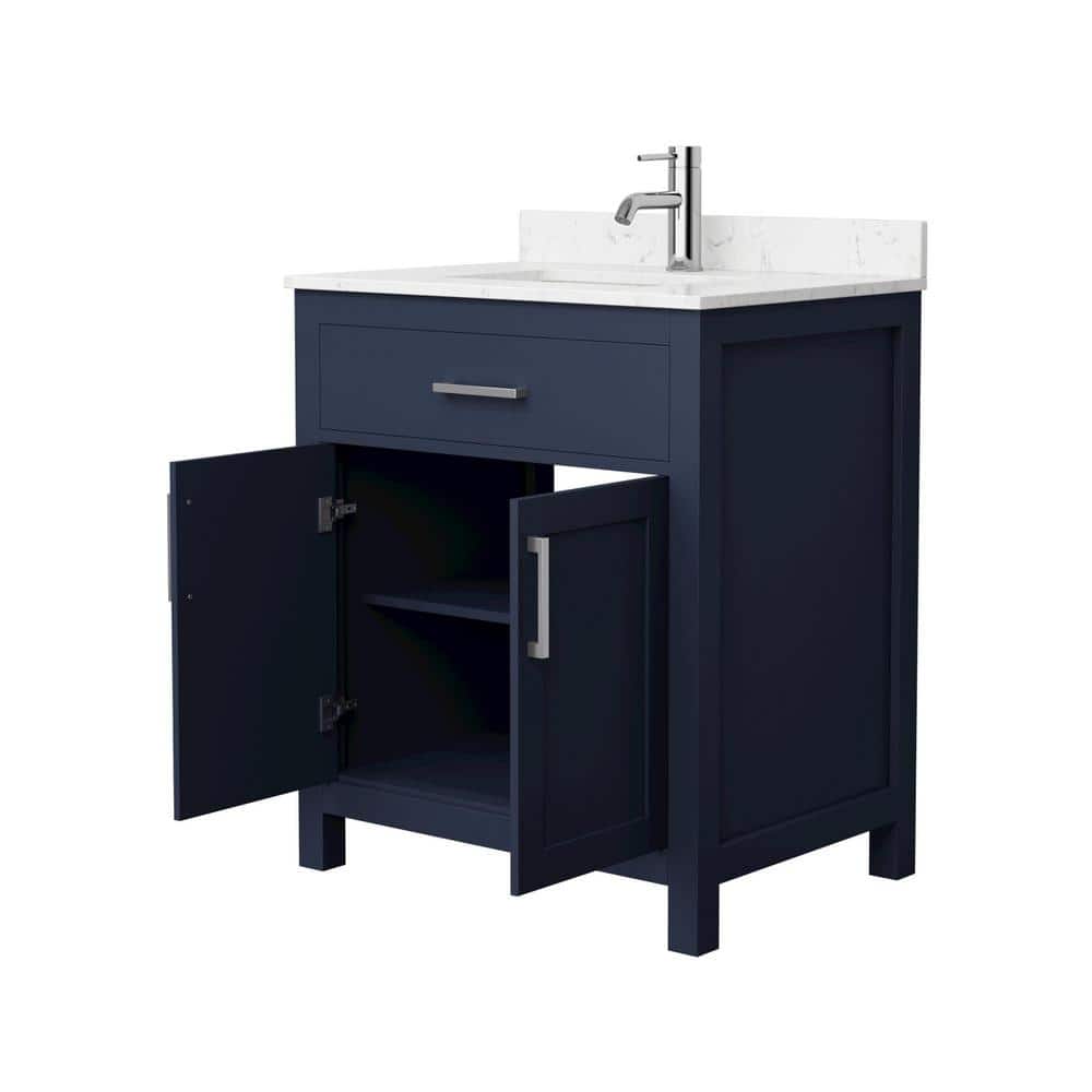 The Wyndham Collection Beckett Bathroom Vanity combines timeless design with modern functionality. Featuring a dark blue finish and a Carrara cultured marble top, it offers ample storage and a sophisticated look for any bathroom.