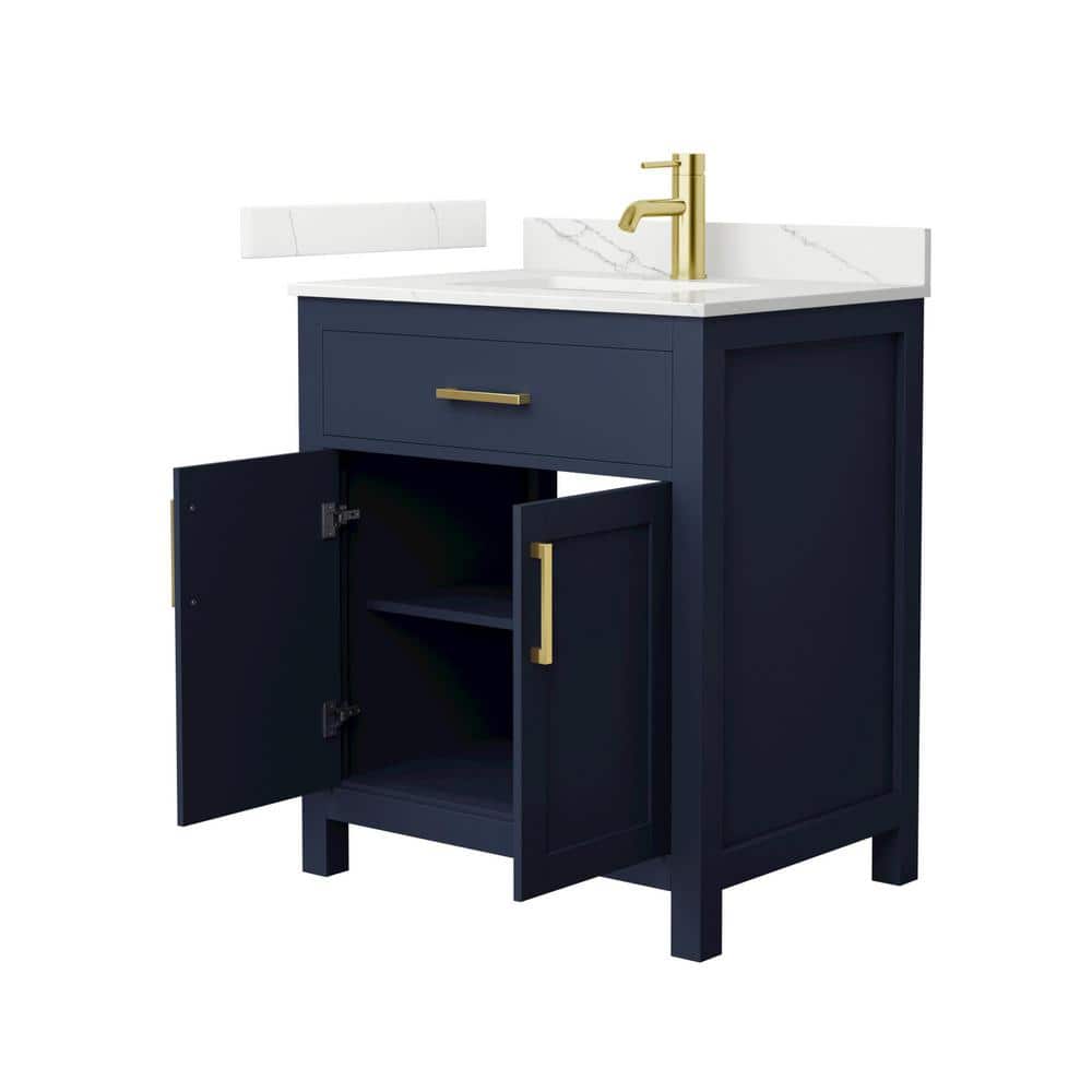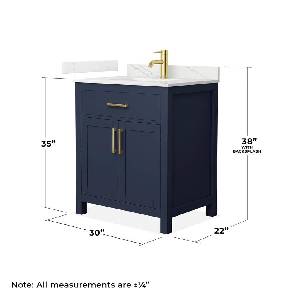 The Wyndham Collection Beckett 30" Freestanding Bath Vanity combines timeless design with modern functionality. Featuring a dark blue finish with brushed gold trim, a Giotto quartz top, and ample storage, this vanity is perfect for any bathroom upgrade.