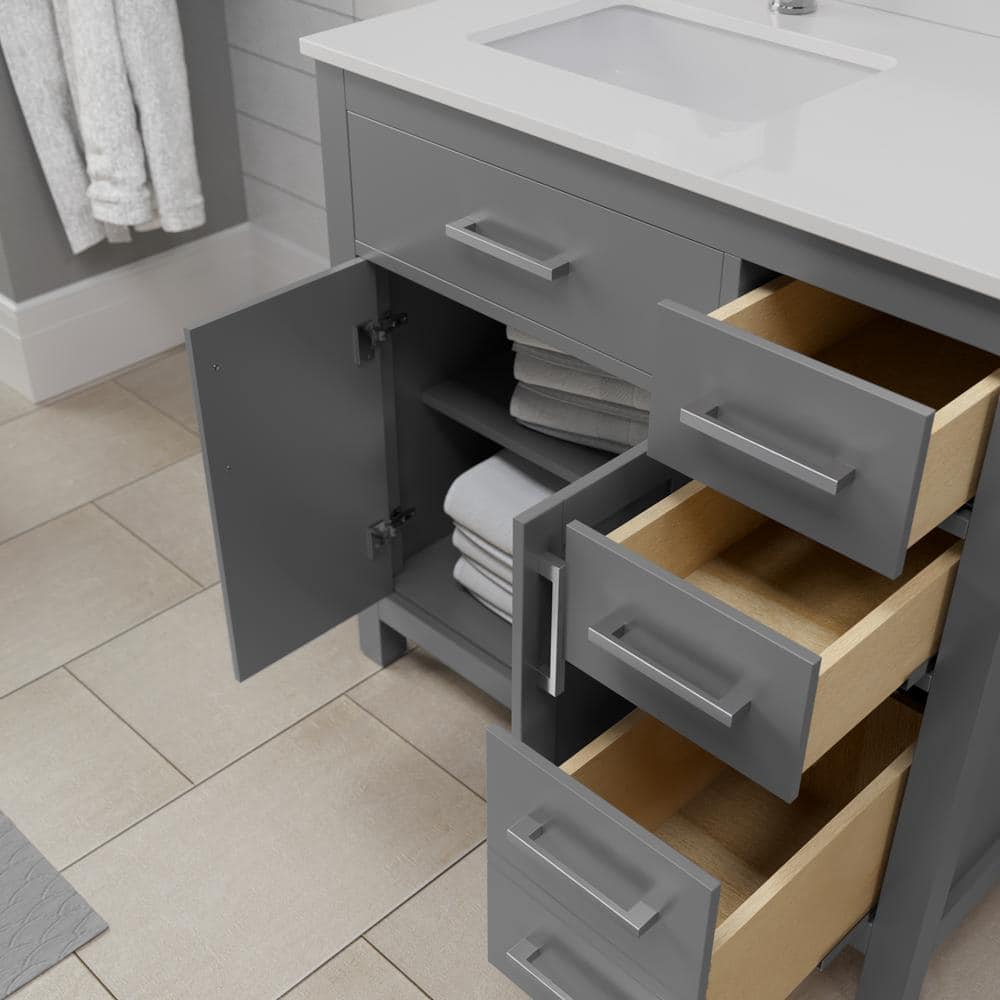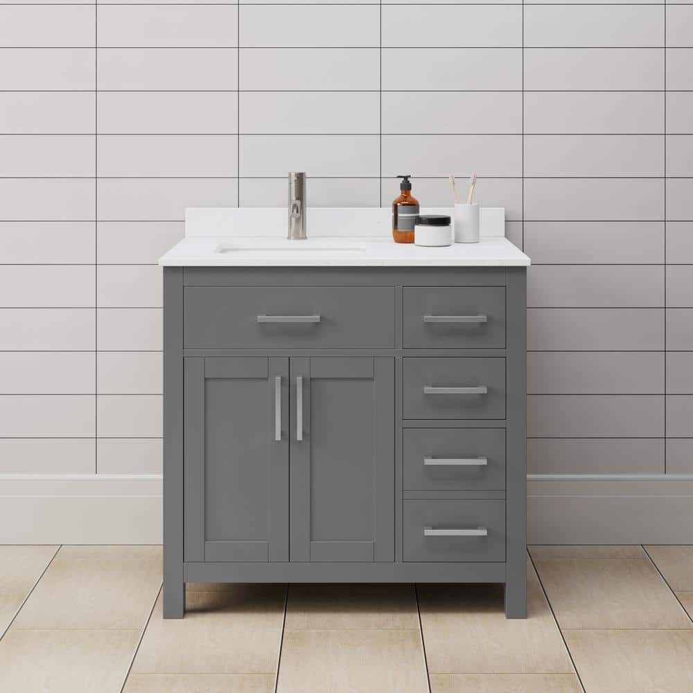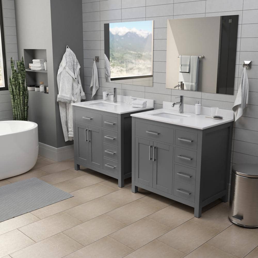 The Beckett vanity is a masterpiece of transitional design, blending modern functionality with timeless elegance. Its dark gray finish and brushed nickel accents create a sophisticated look, while the cultured marble top adds a touch of luxury. Pair it with a sleek single-hole faucet to complete the ensemble. This vanity is not just a piece of furniture; it's a statement of refined taste and practicality.