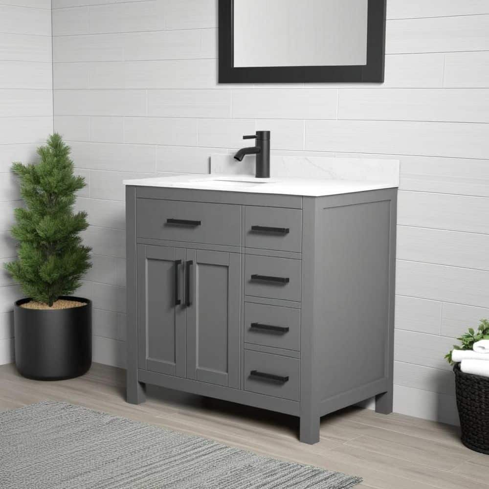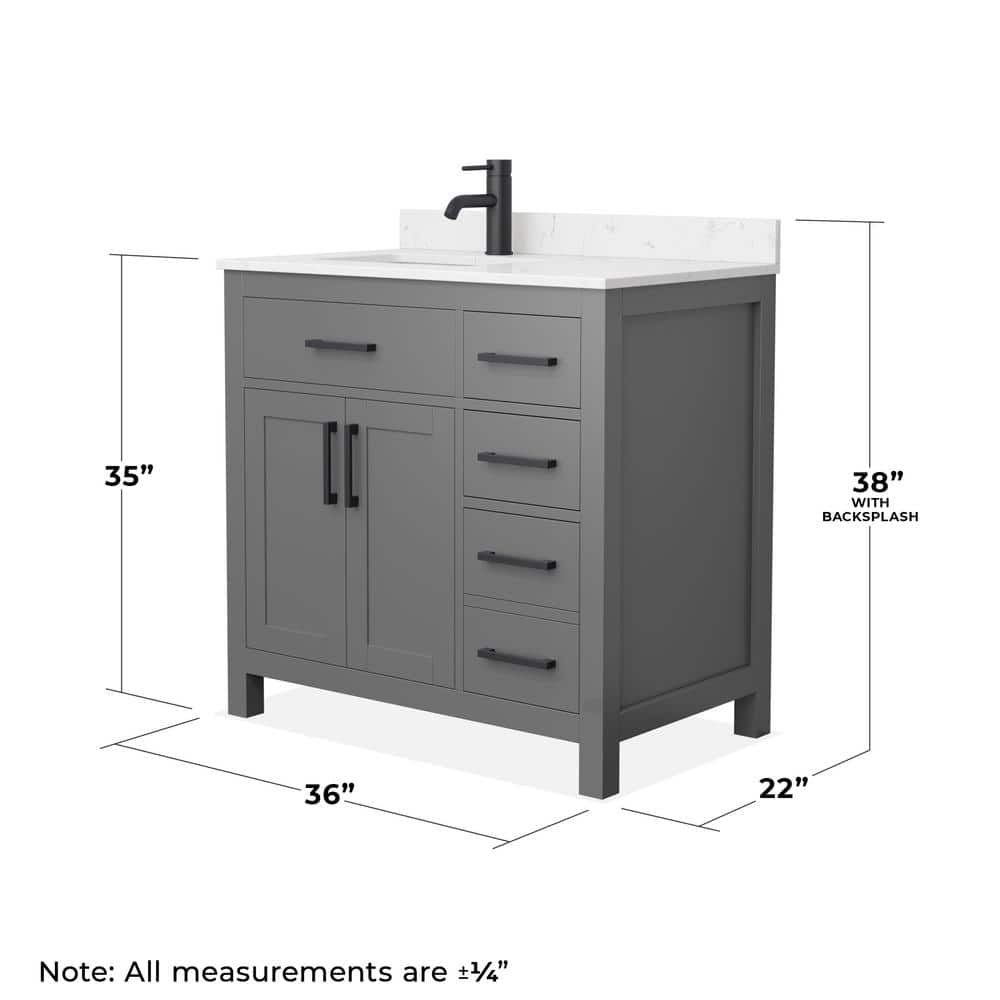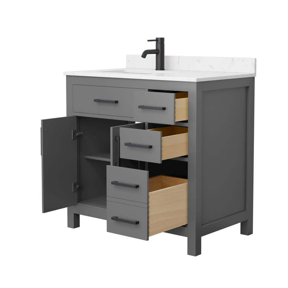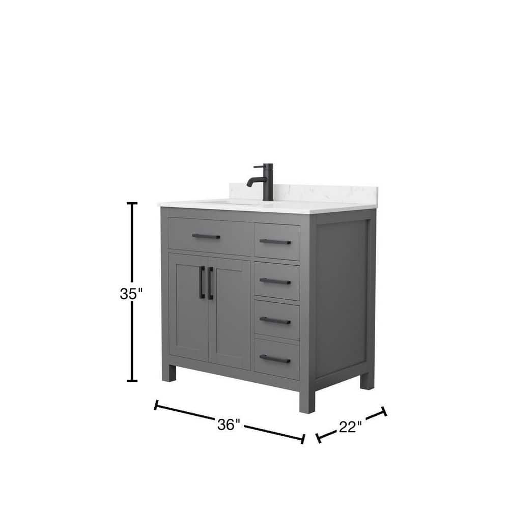 The Wyndham Collection Beckett 36" Bathroom Vanity combines timeless design with modern functionality. Featuring a Carrara cultured marble top and a dark gray finish, it offers ample storage with soft-close doors and drawers.