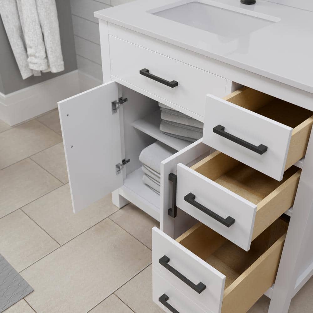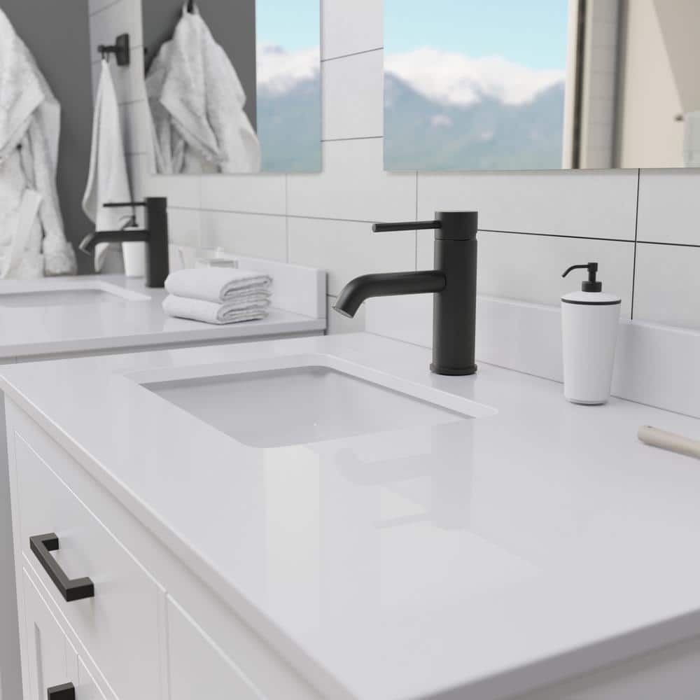 Elegant Design: Features a Carrara cultured marble top and a white cabinet with matte black trim.